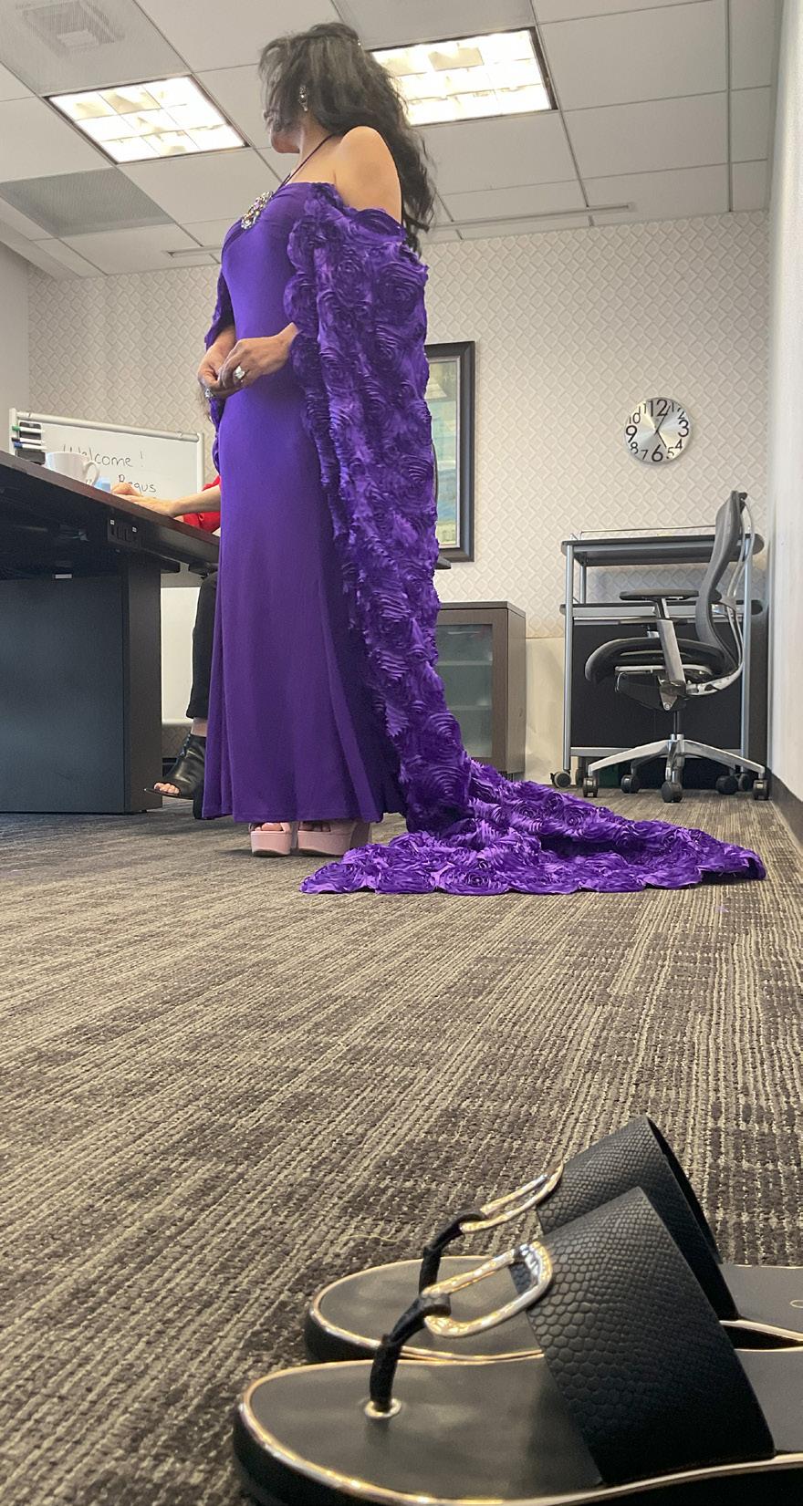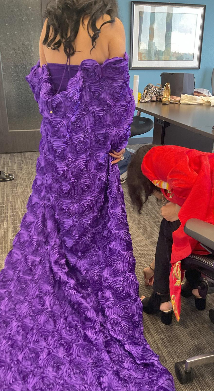 Kiki dressed Norma in an elegant purple gown. I asked Kiki, “What do you call this collection?” She thought for a second, fidgeted the dress, and replied: “The Flower Collection.”