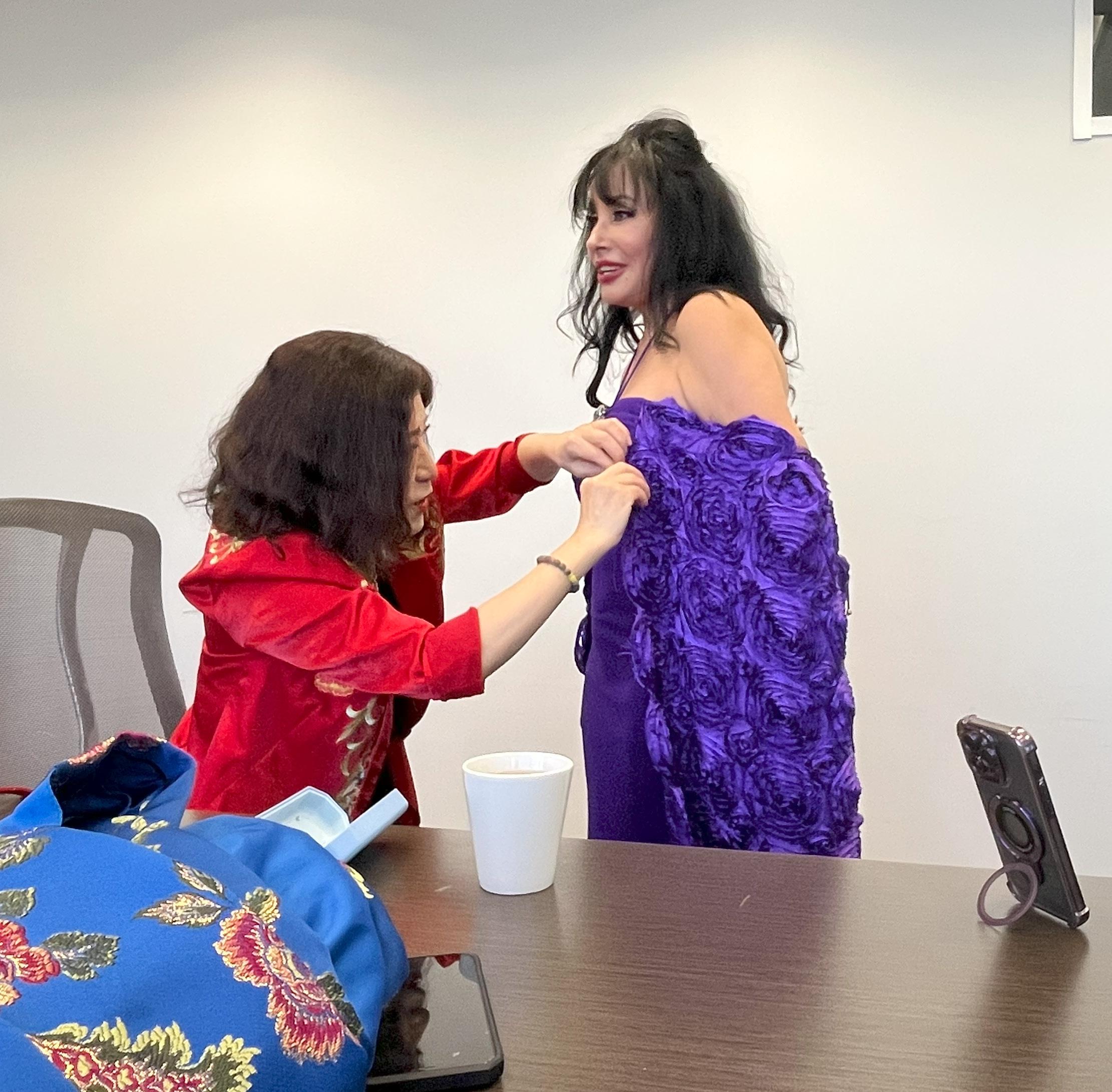 To meet Kiki Wang is to fall in love with a beautiful soul and person. Attention to details; conversational prepping process; and loving fashionista teacher -- those were my impressions of Kiki Wang being in the same room with her. She was dressing Norma Voelkel for a showing of Paul Rodriguez’s movie, “HOLY CASH,” at the TCL Chinese Theatre in Hollywood. Norma plays a role in the movie.