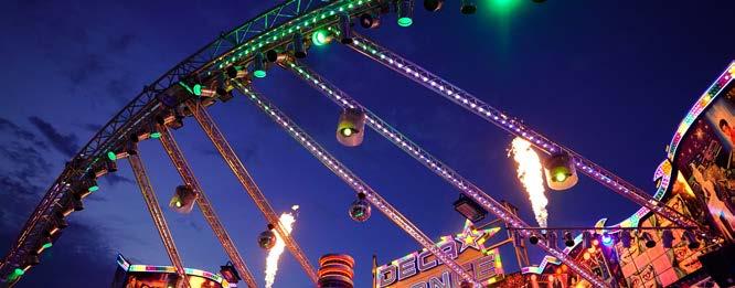 Roller coasters, drop towers, or Ferris wheels are set up at the festival to pump up the adrenaline, attract attention, and provide great photo ops.