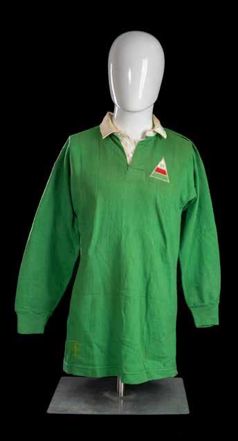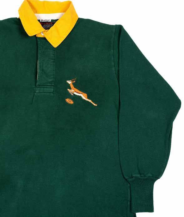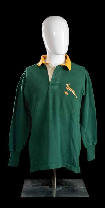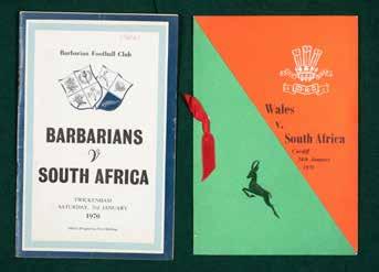 Springbok jersey match-worn traditional green with yellow collar, embroidered leaping Springbok, yellow canvas number 15 stitched to reverse, label for Maxmore. Size 38. To accompany: Programme Barbarians vs. South Africa, 31st January 1970, every member of the Barbarians and South African sides have signed it in red ink (good condition).Wales vs. South Africa dinner card, 24th January 1970, internally lists the Welsh team then the menu, toasts, etc. (good condition).