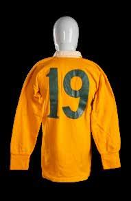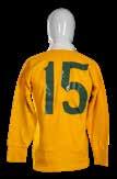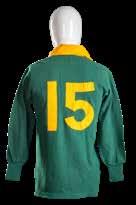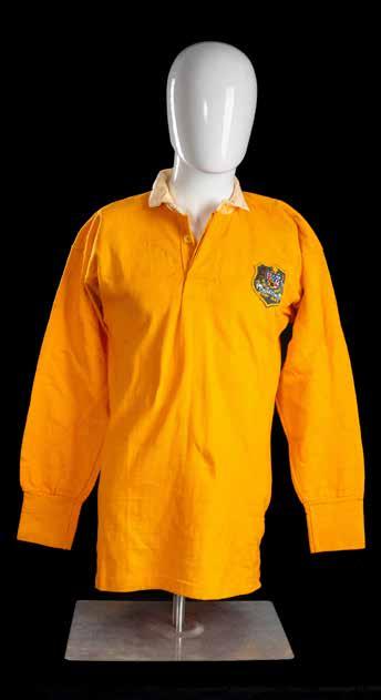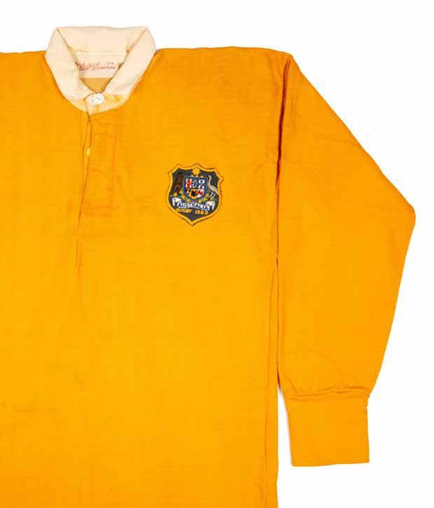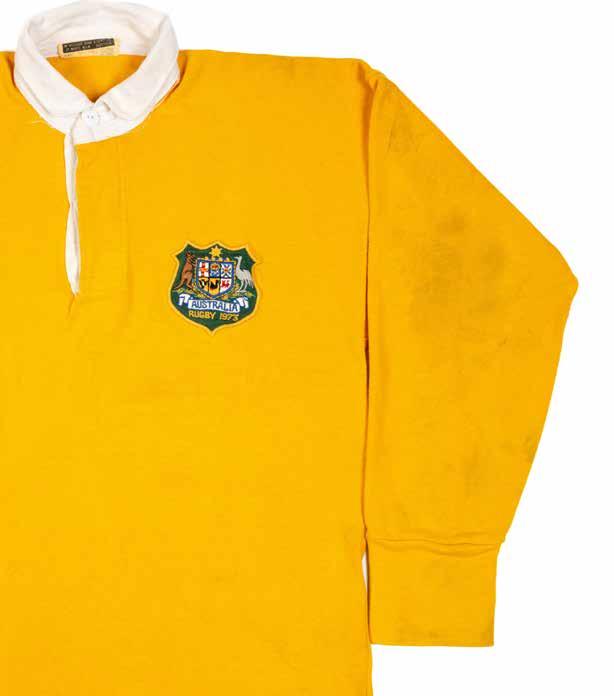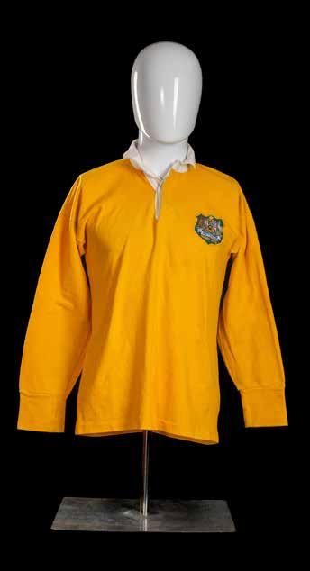 Jersey match-worn by Russell Lance Fairfax (b.1952) in traditional ‘gold’ with white collars, embroidered crest to shield badge bearing ‘Australia Rugby 1972’, green vinyl No.15 stitched to reverse, bears collar label for Westmont.