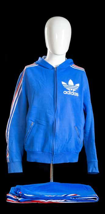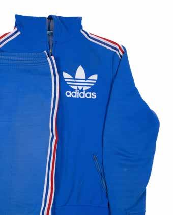 Blue Adidas hooded two-piece training suit worn by Jean-Pierre Rives (b.1952). LA MARQUE AUX 3 BANDES, Creation Entex draw string hood, two zipped pockets, felt applied Adidas logo right left breast, white, red & blue stripes to sleeves, JOHN P.R. Williams stitched name tag above Adidas branding tag. Trousers with draw string waist, white, red and blue stripes to legs, whooped and zipped leg bottoms.