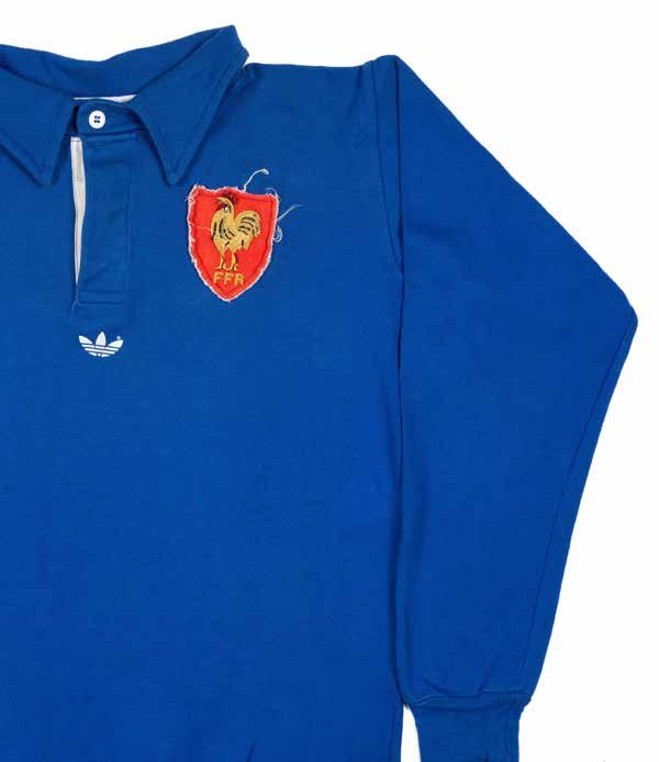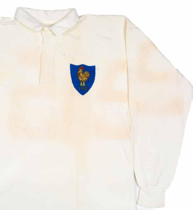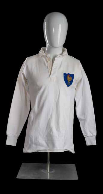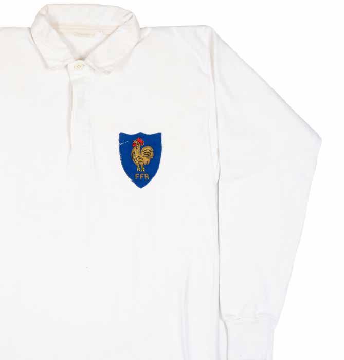 Jersey match-worn for Jean-Michel Aguirre (b.1943) in all-white with shield shaped blue crest applied to chest featuring braided standing cockerel and ‘FFR’ below, narrow and squarish blue canvas number fifteen to reverse, label for Pure Cotton only. Believed from 1973 bearing in mind the number. France alternated between blue and white in this period, playing their home matches in white.