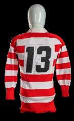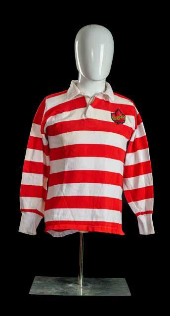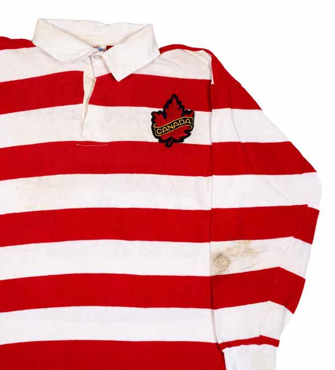 The jersey match-worn by full-back Barry Legh in red and white hoops, bearing embroidered maple crest to chest with ‘CANADA’, black number 15 stitched to reverse, Umbro label.