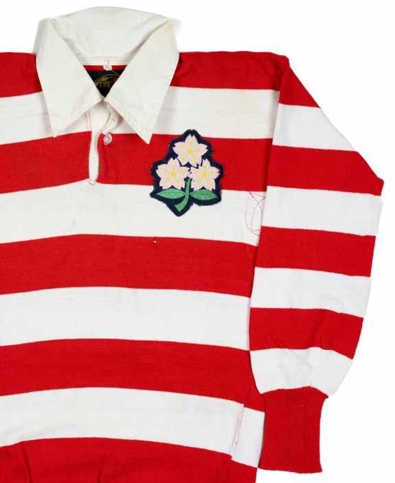 Red and white hooped jersey, match worn by Ueyama (b.1939). Embroidered and silk crest of green stem with three pink and yellow cherry blossoms, to black badge outline and then applied to chest. Black cotton No. 15 to white square panel on reverse, interior label for Sceptre. To accompany, extracts from a Japanese magazine covering the tour, a black and white photograph of JPR with ball in hand being tackled, extracted Wales XV team line-up.