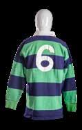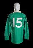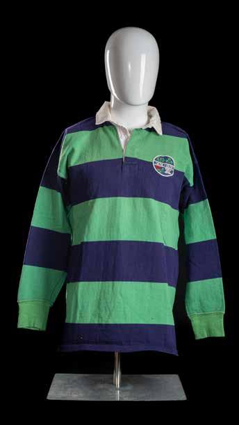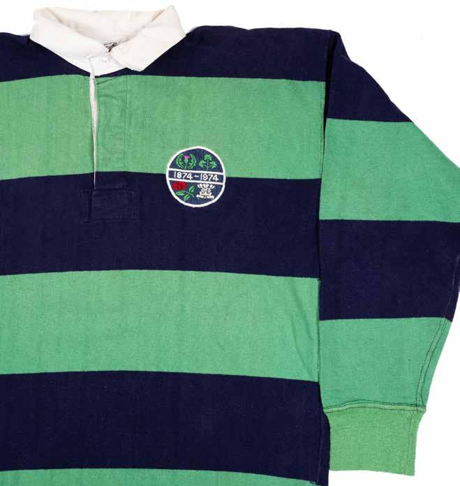 A rare green and blue hooped jersey, match worn by (John) Fergus Slattery (b.1949). Embroidered circular badge with the four crests of Scotland, Ireland, Wales and England. Vinyl number 6 stitched to reverse, label for maker Umbro International and supplier S S Moore of Belfast.