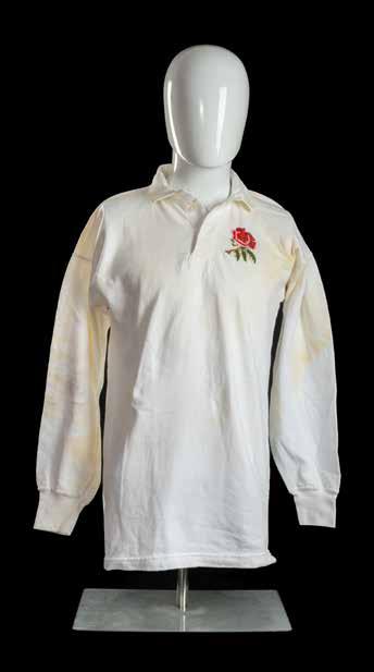 Jersey believed match-worn by Alastair James Hignell CBE (b.1955) in one of his several test matches against JPR. Traditional all-white, embroidered three-colour rose on stem with toned leaves, black felt number 15 to reverse, Umbro International label to the interior. Hignell faced JPR in each of the suggested seasons – he was never on the winning side!