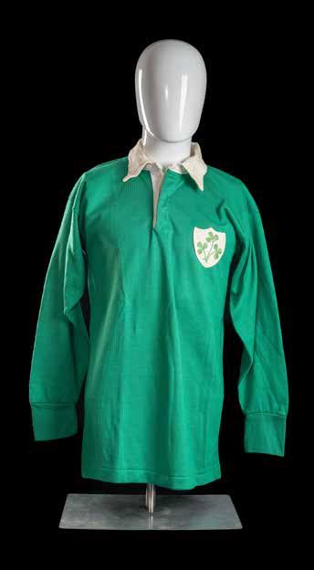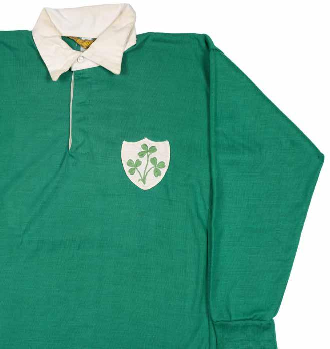 Traditional Ireland International Rugby Union matchworn jersey in green with white collar, embroidered shamrock to shield badge stitched to chest, stitched number 15 to reverse, O’Neills label to inside collar. In good condition.