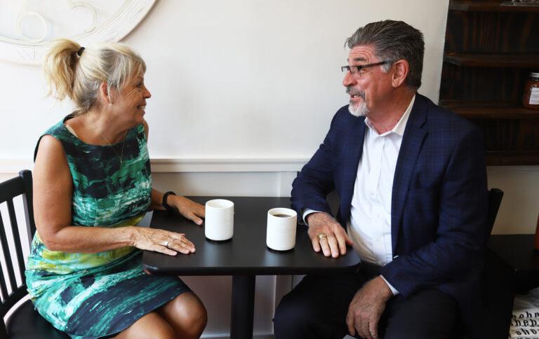 She Brews founder Rhonda Bear (left) visits with RSU Interim President Dr. Mark Rasor.