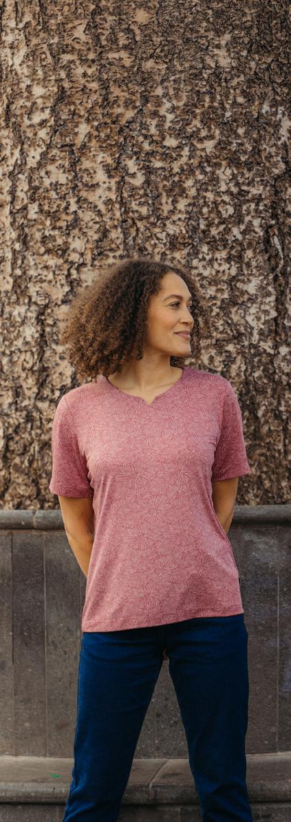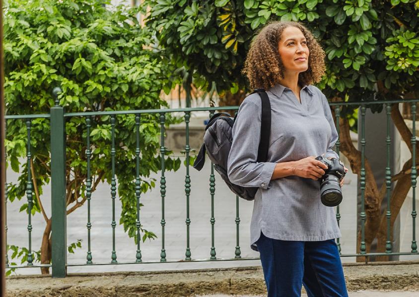 Loose fitting and comfortable travel top with UPF40+ sun protection, a hidden zipped pocket, and crease-resistant fabric. Perfect for warm days exploring the city.