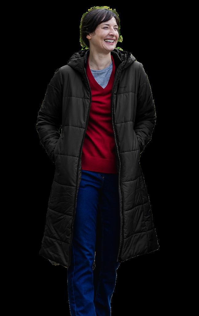 A warm, lightweight winter coat with Insuloft insulation, adjustable hood, and long-length design. Ideal for cold, dry days in the city.
