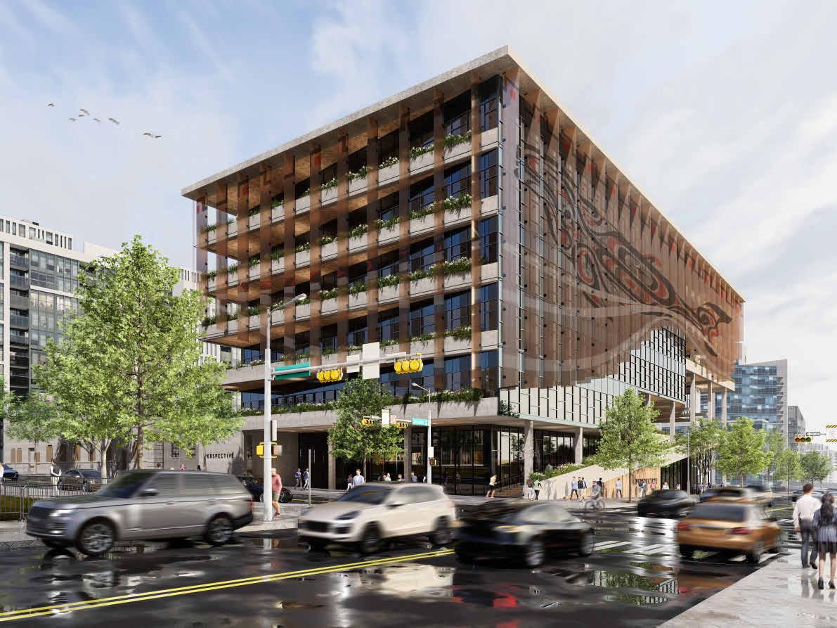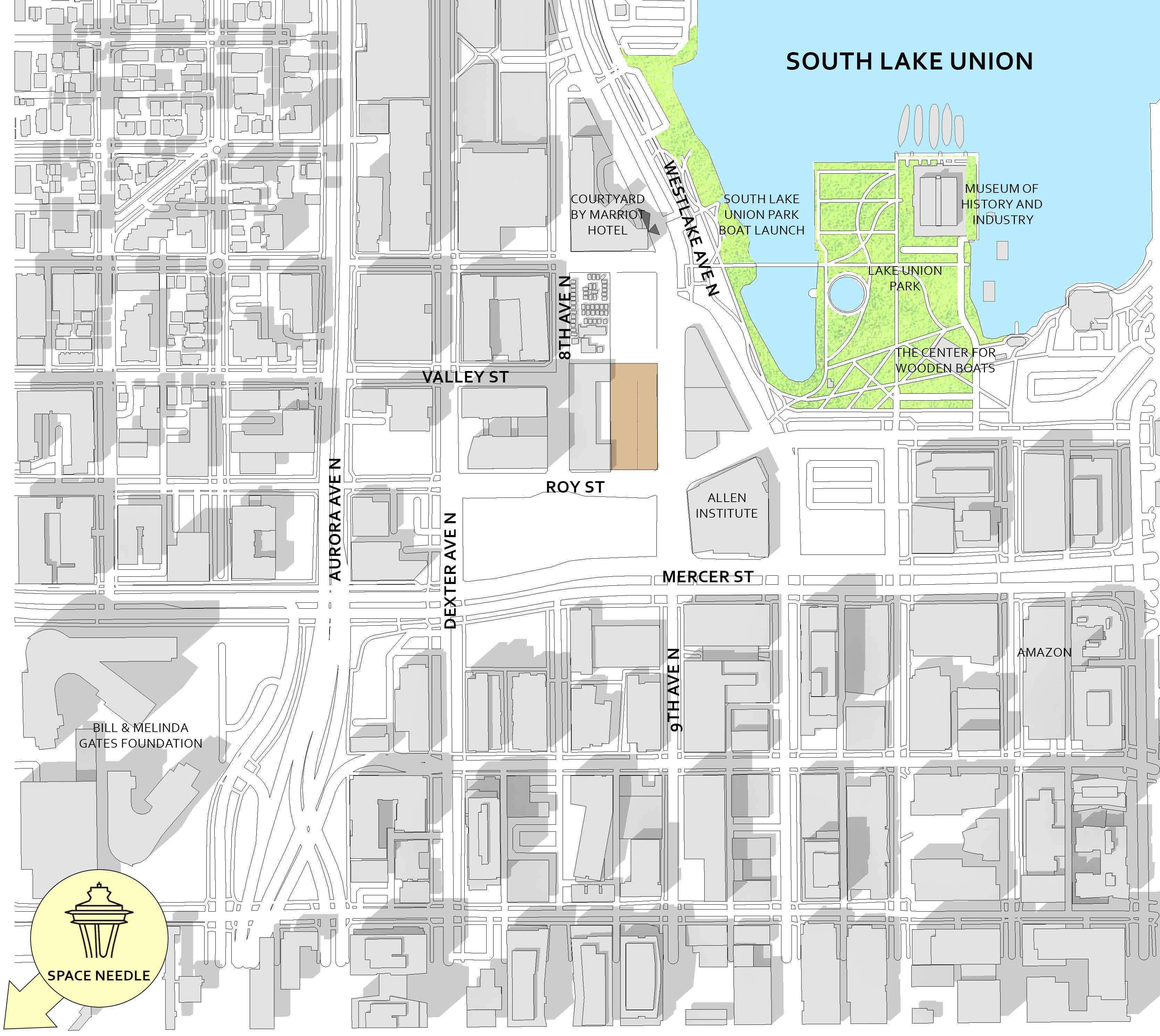 Our project creates a space that is accessible, inclusive, and interactive for the community. It celebrates and represents the historical context of the cultural landscape through art. Our skin structure incorporates large murals, designed by indigenous artists, spanning the lengths of the building, which change from different perspectives. This project enriches the community by supporting public art initiatives, local artists, and small business' in the everchanging art gallery, cafe, and gift shop. By extending the public's welcome past the second floor to the large courtyard on the third floor and rooftop restaurant/bar, we are blending the lines between the building and the street. The design prioritizes sustainability with systems like vertical fins for sun shading, recycled materials, a rainwater collection system, solar panels, and incorporating biophilia. By promoting art and creating an attraction/landmark, the building becomes one that is memorable and complimenting to South Lake Union’s beautiful landscape.
