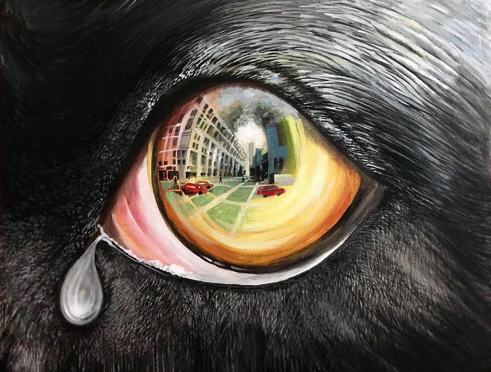 This painting portrays the perspective of a stray dog living amongst a human dominated world. The busy street, tall buildings and cars, that are reflected off the dog’s eye, represent the lack of space and closure for stray animals on the streets. I added a teardrop to emphasize the plight of these animals. The reason for the dog’s eye being wide open is because of the fear that it faces on a day-to-day basis. I wanted to incorporate both an emotional and angular perspective through this piece.
