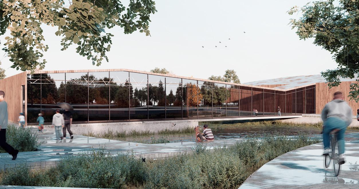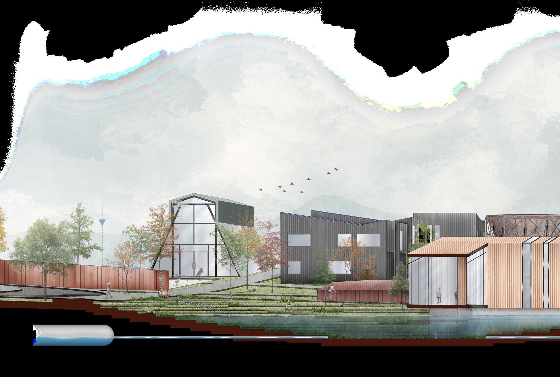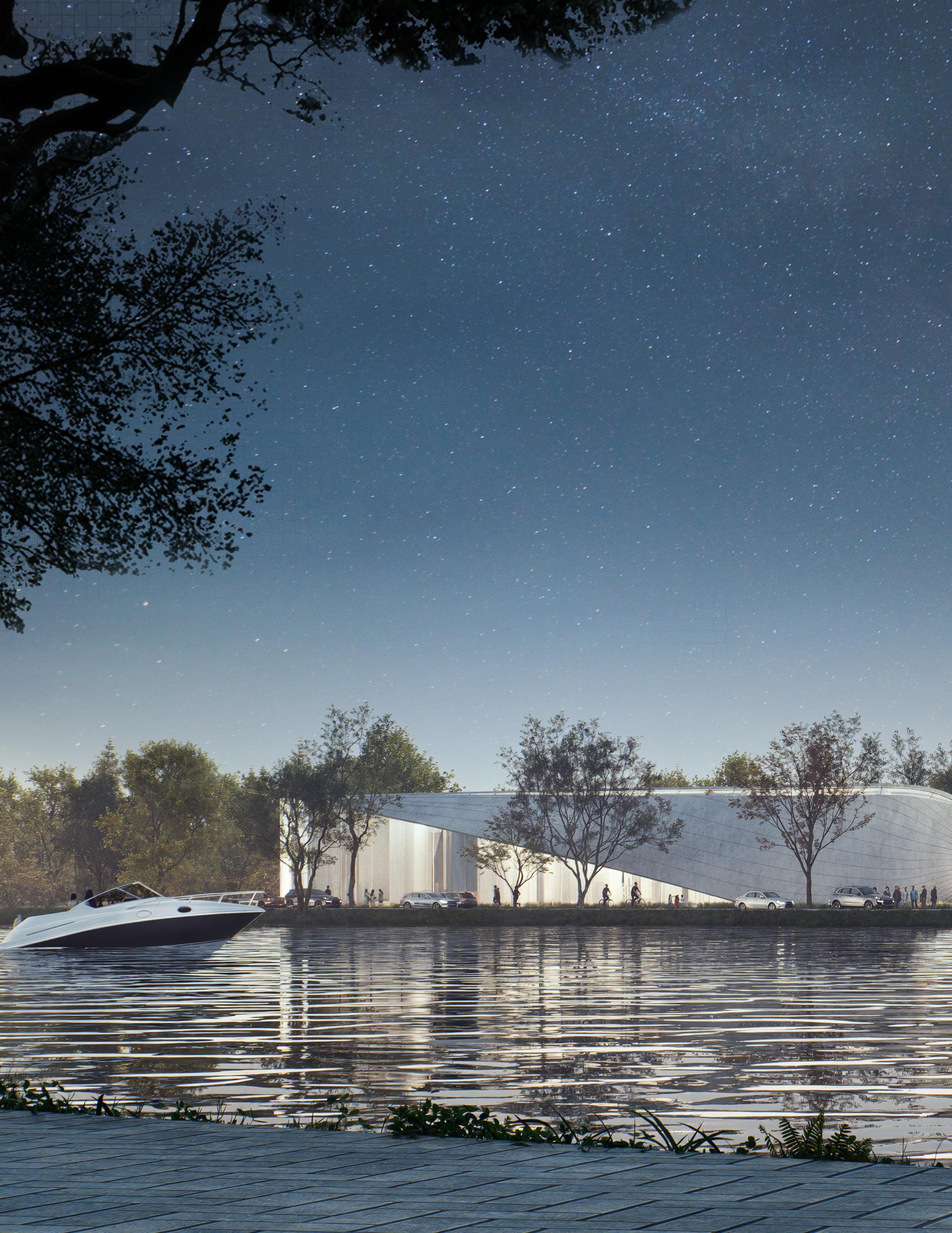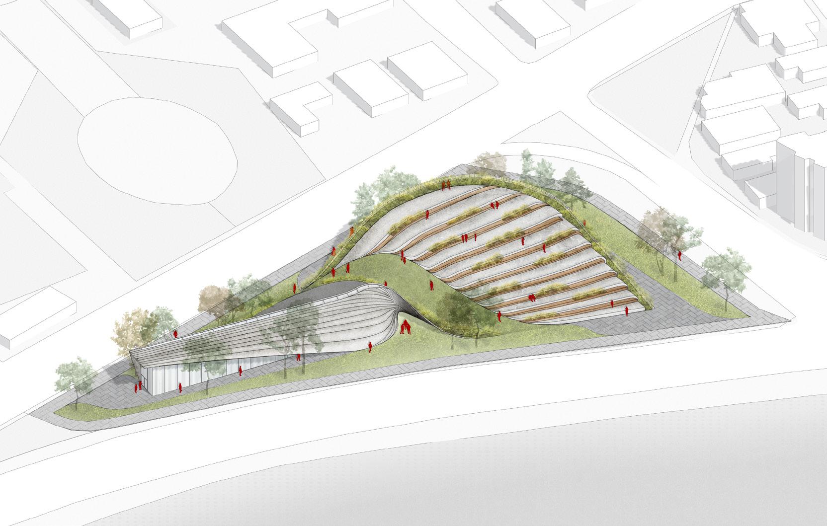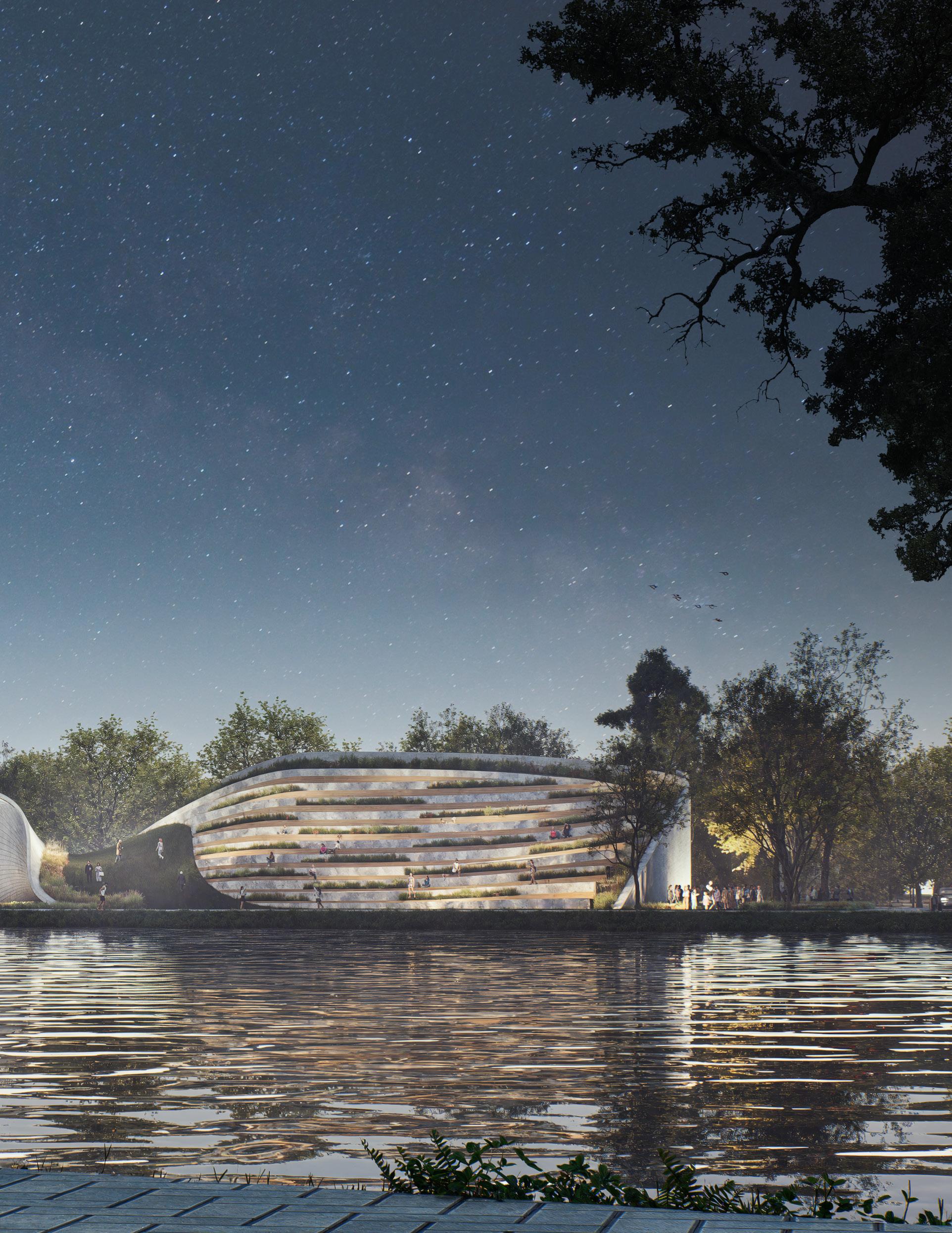 Set in Riverbend Park along the Charles River in Boston, the center rises gently from the land as a walkable topography. Sloped surfaces extend into the landscape, inviting the public to climb, sit, and engage. The boundary between inside and outside dissolves, creating playful, open moments for gathering, performance, and reflection. This architecture belongs to its community—not through signage or programming, but through its very design.