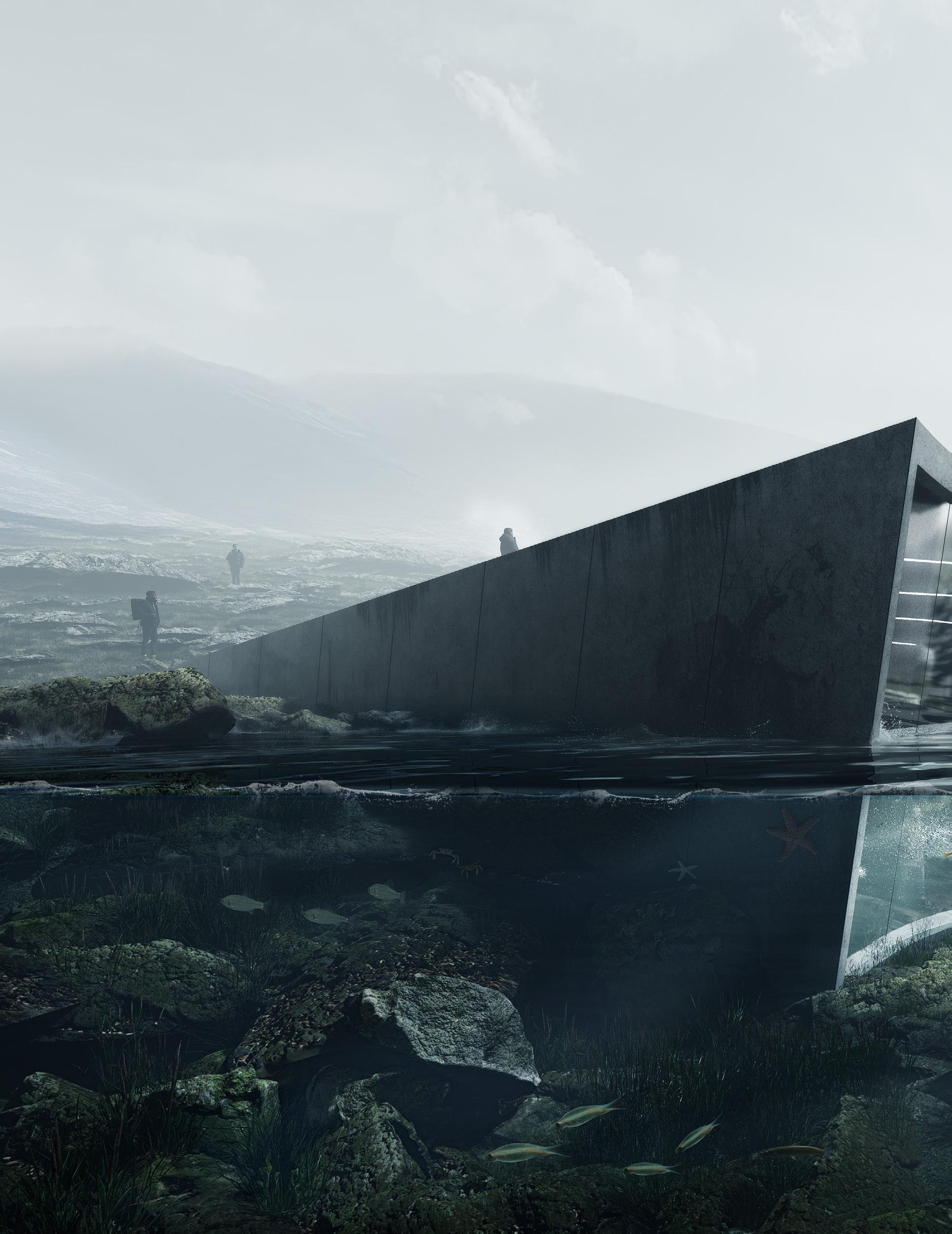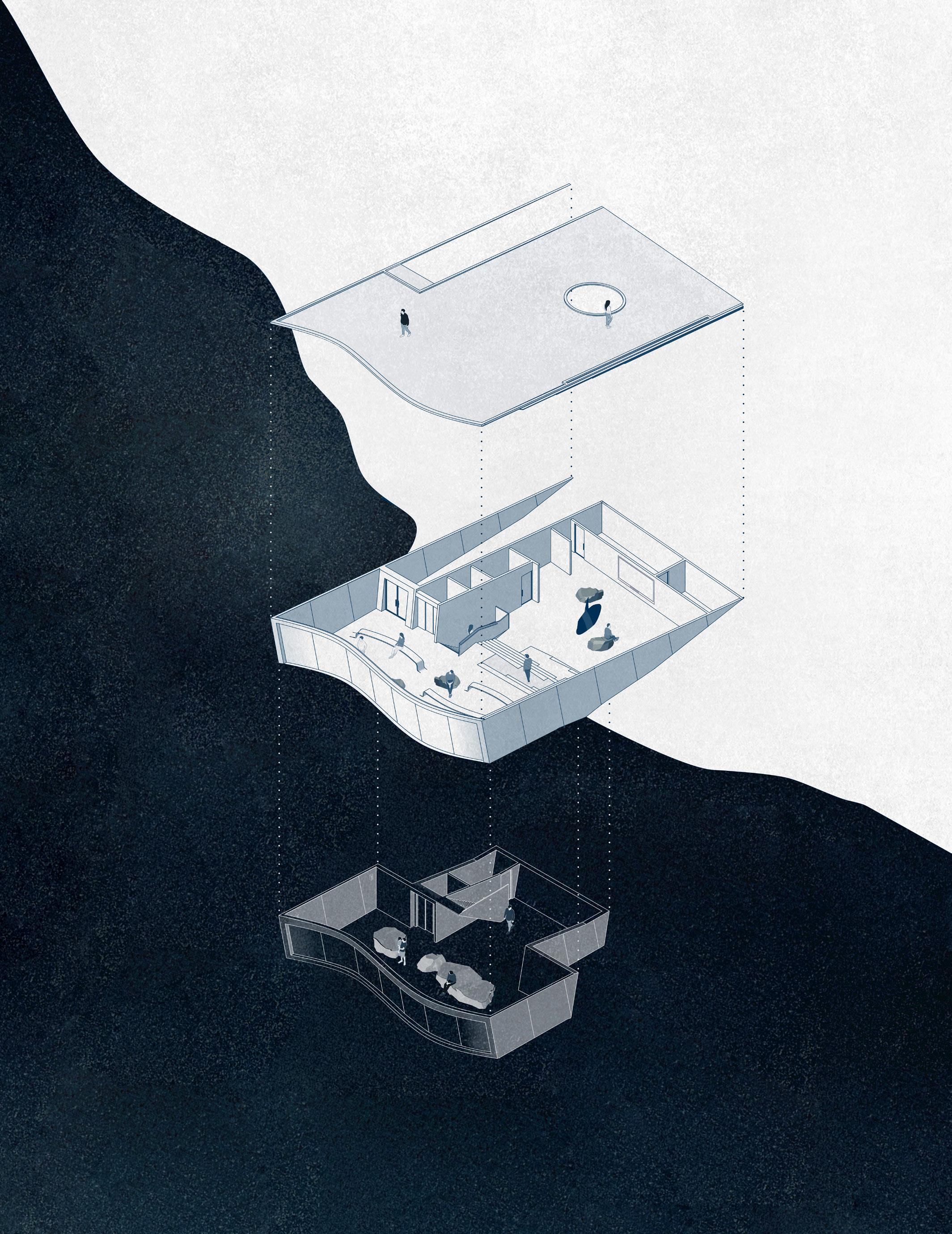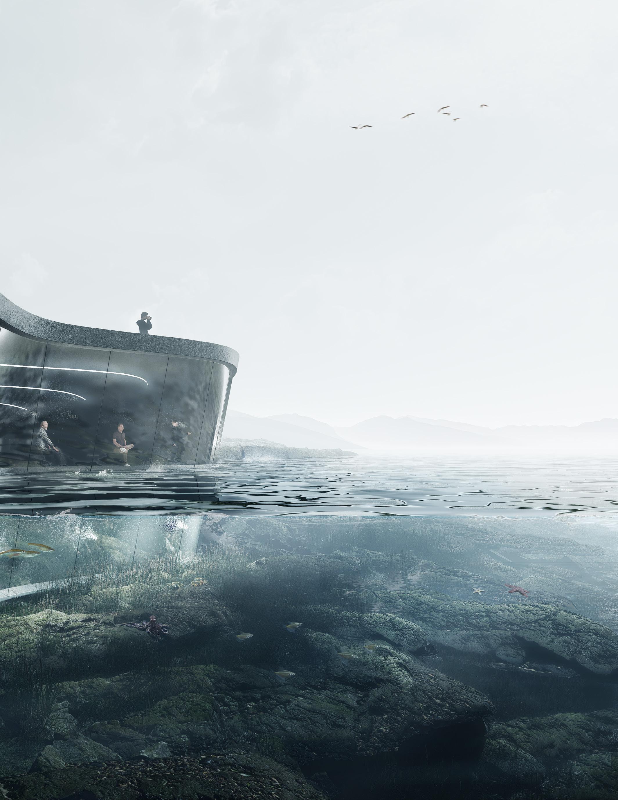 Resonance emerges as a harmonious dialogue between architecture and the ocean. Inspired by the undulating rhythm of waves, the structure’s curved glass facade reflects the fluidity of water, capturing light and movement. Stretching boldly into the sea, it forms a dynamic viewpoint, inviting visitors to immerse themselves in the vastness of the horizon. The walkable roof, interactive and sculpted like rolling tides, offers a tactile connection to the environment. Inside, an information space educates visitors about marine life, while seating flows organically from the ground, mimicking waves and integrating natural rock formations. The structure is crafted from concrete for its durability and ability to withstand the harsh marine environment, grounding the design in strength and permanence. Below the surface, an underwater haven reveals the ocean’s symphony through a hydrophone system integrated as a surround system, amplifying its vibrant, unseen life .