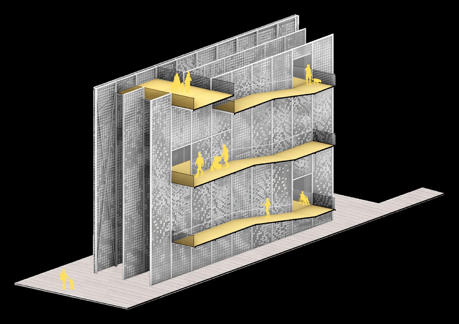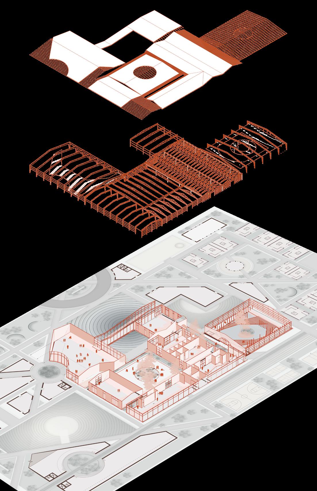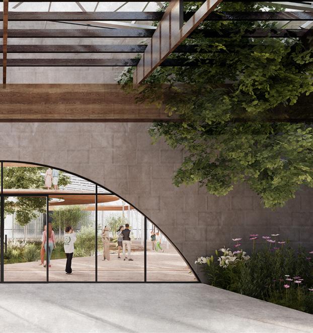 The form embodies a dialogue between research, experimentation, and performance. This relationship invites visitors to experience not only the final outcome but also the process behind it - prototypes, tests, and evolving ideas. The Twist above functions as a canopy, symbolizing this connection. The roof extends this experience, offering visitors an elevated vantage point to enjoy the surrounding views, honoring the site’s former life as a public park.