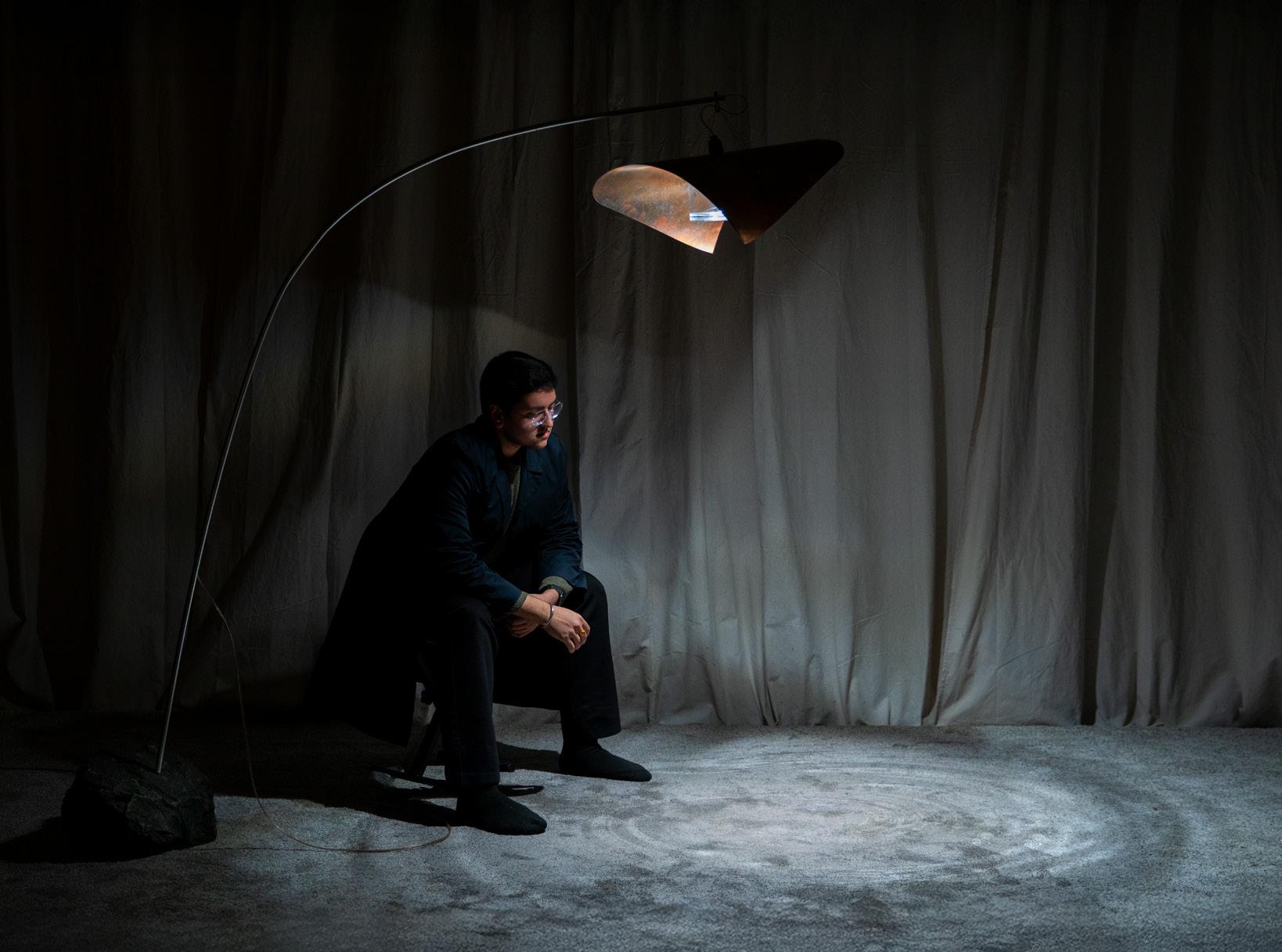 The organically shaped copper lampshade exudes warmth and patina, while the solid rock base and sleek metal pipe bridge natural and industrial elements. The design of the lamp is thoughtfully modular, with a detachable lamp pole, removable lampshade, and acrylic vessel, allowing for seamless transport and reassembly. By merging light, motion, and materiality, this design invites reflection on the echoes of water and the beauty of constant motion, transforming spaces into sanctuaries of quiet wonder.