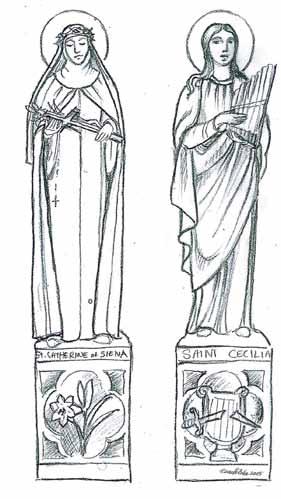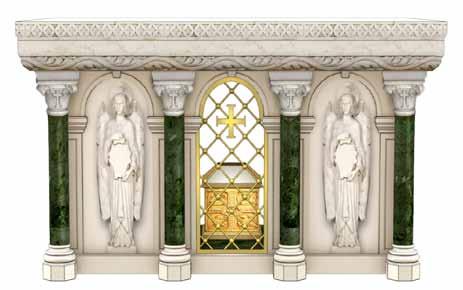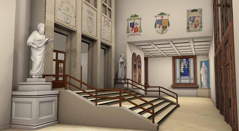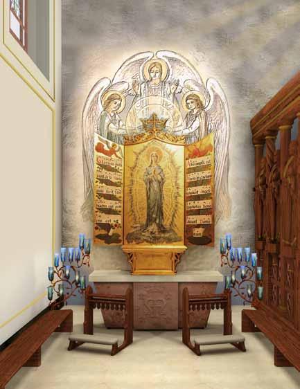 The main wall of the sanctuary will be dramatically transformed with a larger than life relief mural of the Transfiguration of Christ with a mural of the Holy Spirit. The new Cathedra with Bishop Montforton’s coat of arms and the deacons’ chairs will harmonize with the spirit of the sanctuary. Statues of the Apostles will be worked into a new walnut screen on either side of the Sanctuary. The redesigned Communion rail will be a reminder of Christ creating an opening in the veil that separated the common people from the holy of holies in the Temple when His side was pierced on the cross.
