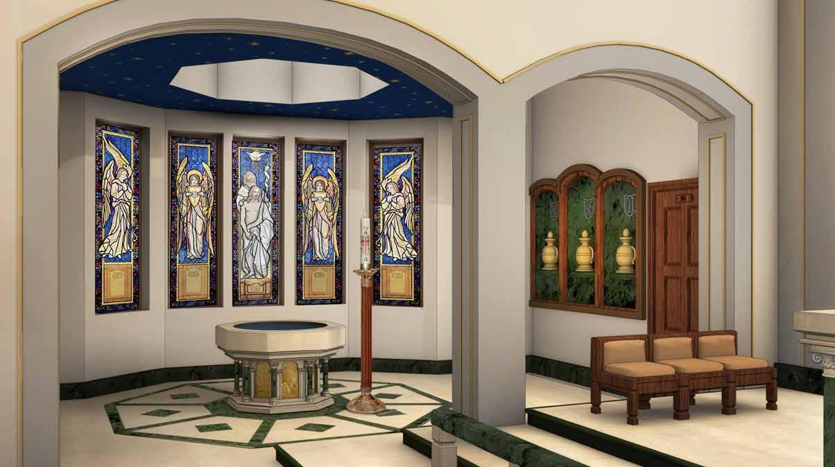 The Bishop’s Annex will be an extension of the Sacristy; the existing French windows depicting the life of Christ will be reused to create floor to ceiling windows in the Bishop’s prayer room. Two large murals will be installed: The Transfiguration and an image of the first Cathedral. Above the Bishop’s Coat of Arms inlayd in the carpet, there will be an image in medium blue sky with a constellation of day the diocese was founded (1944)