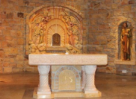 • The back wall of the sanctuary featuring adoring angels was hand-carved in Italy and carefully painted and detailed with accents of 23-karat white gold on-site.