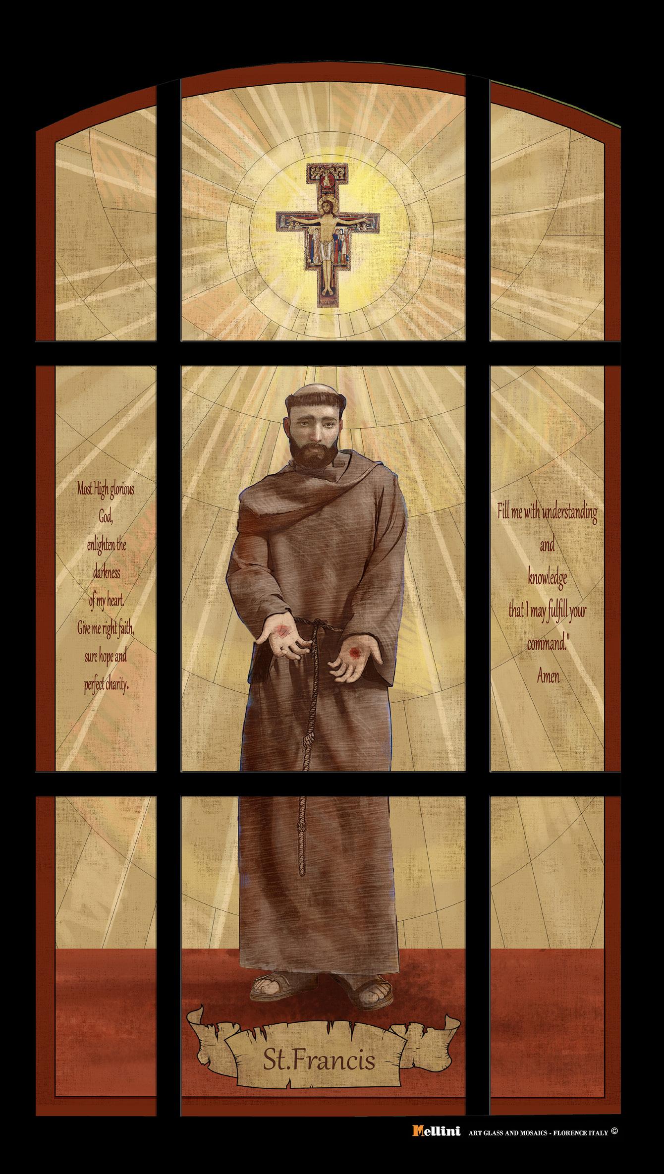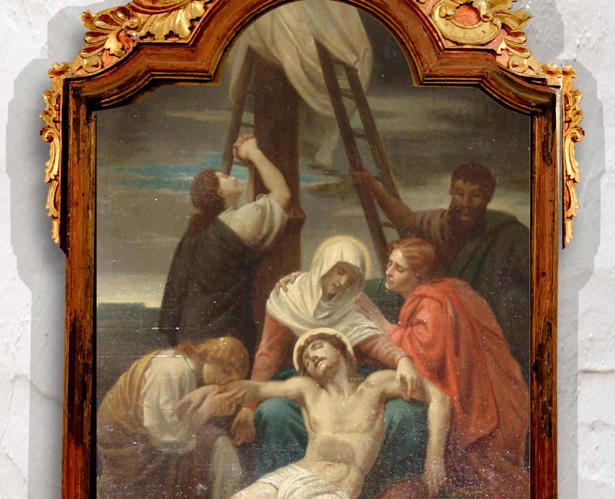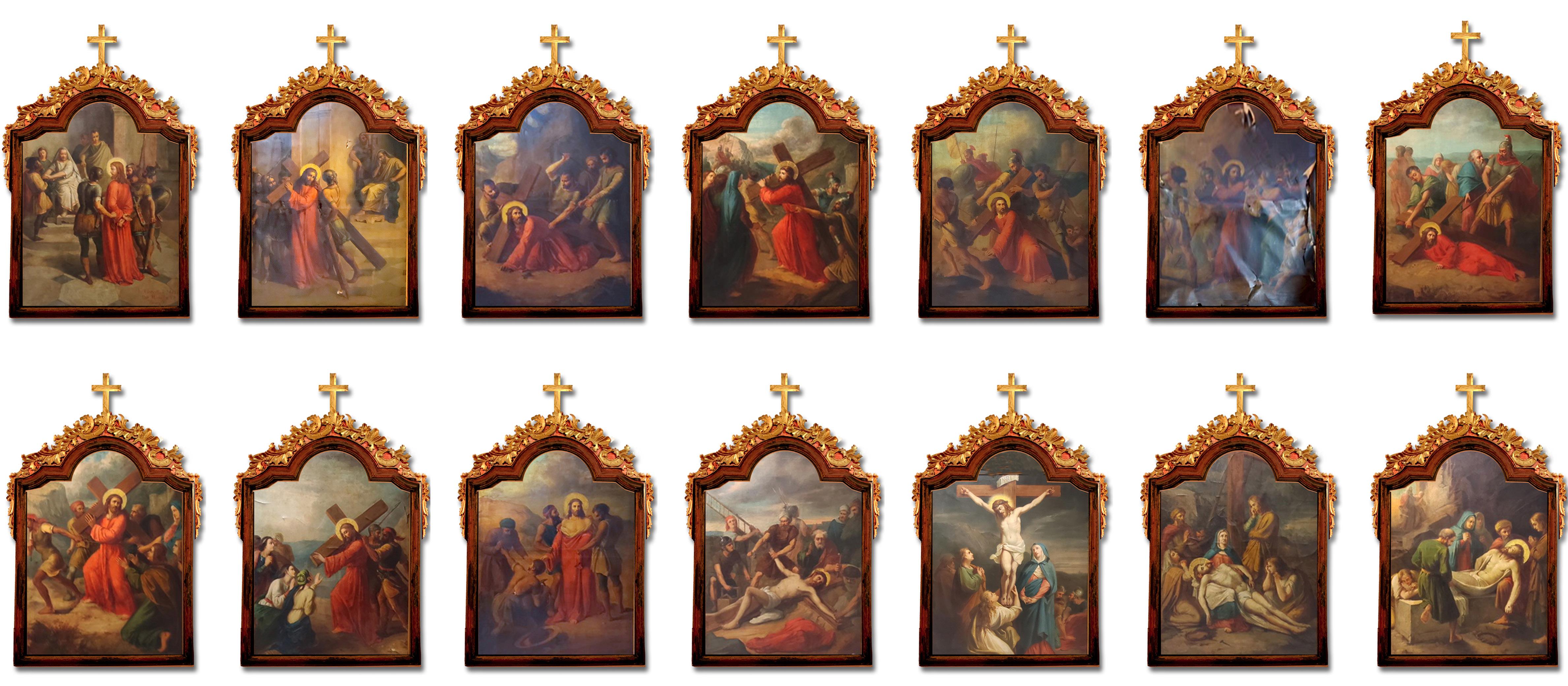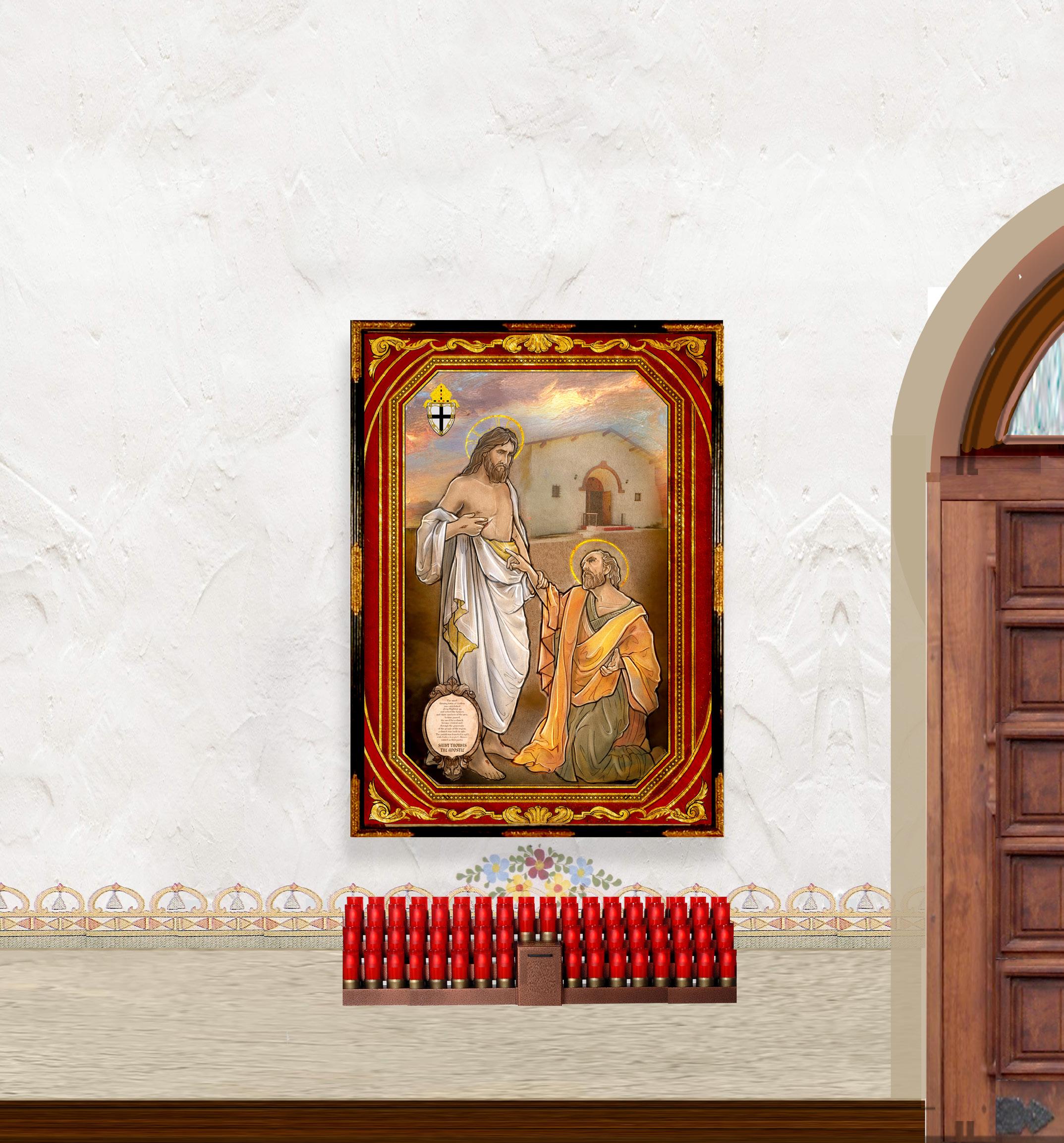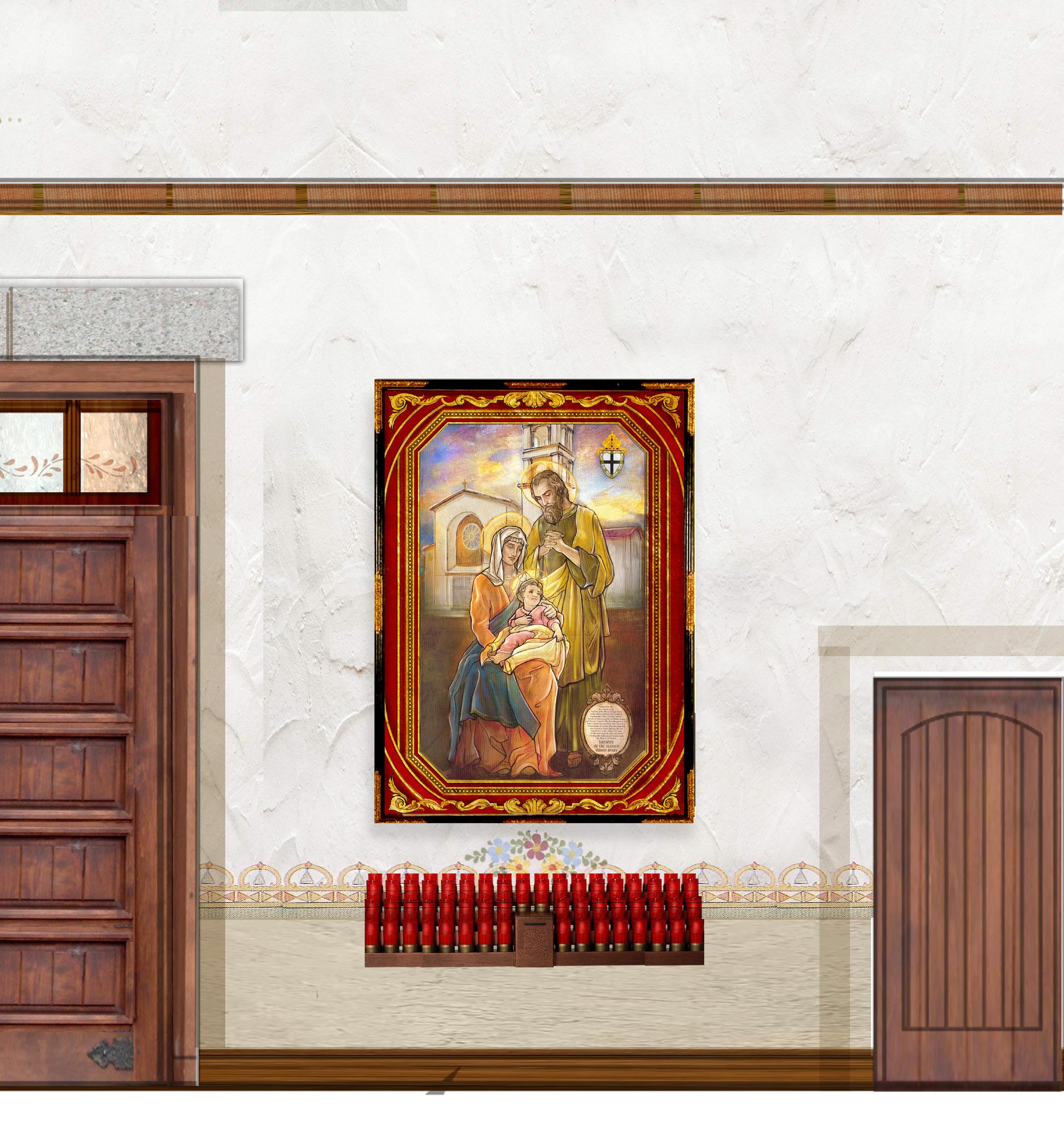 Low relief carvings or hand painted Mission style frames, with antiqued gold leaves and Franciscan mission style colors