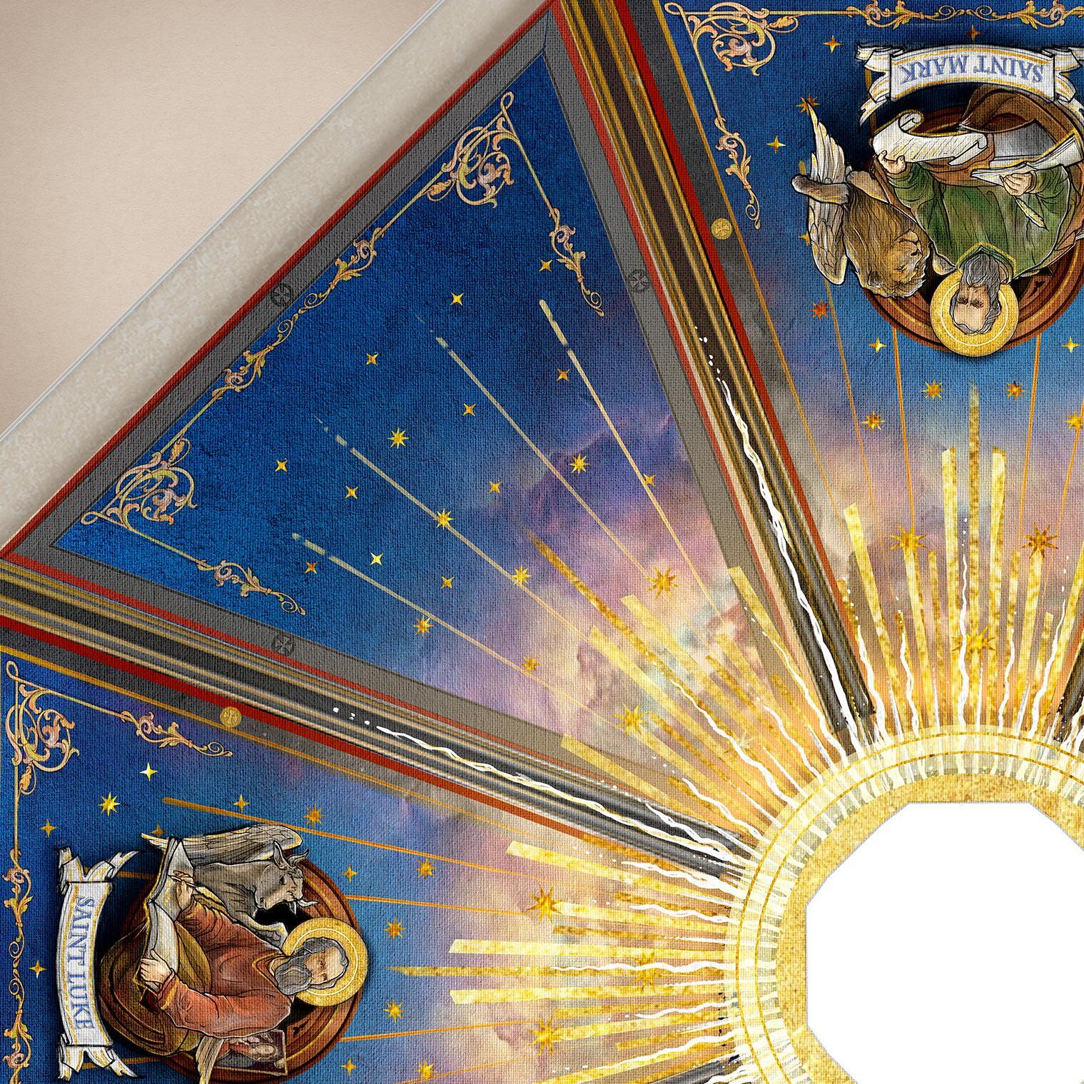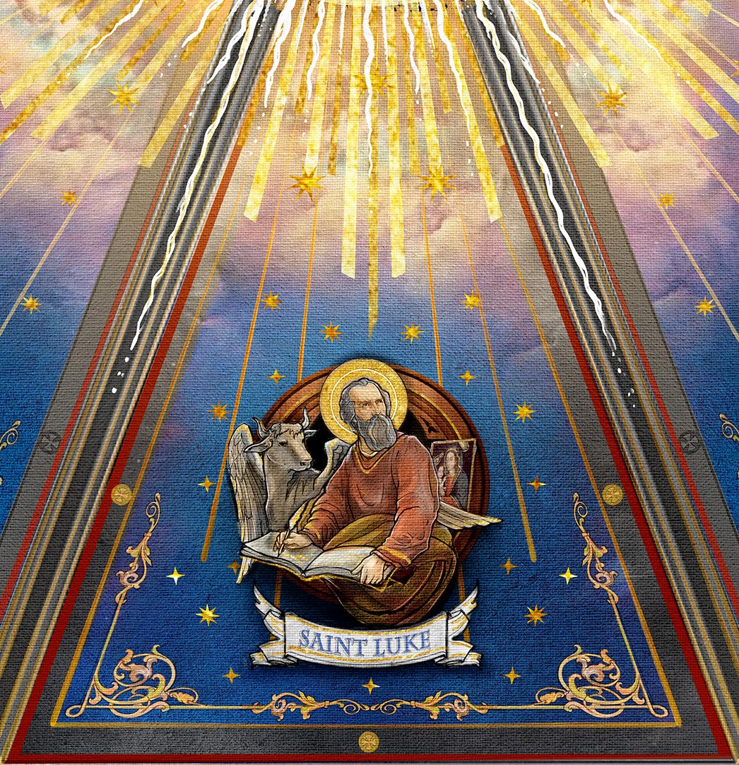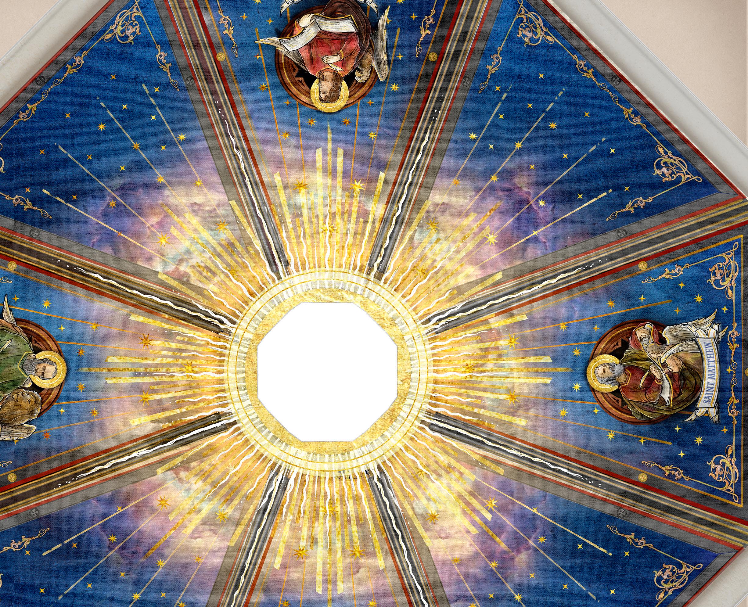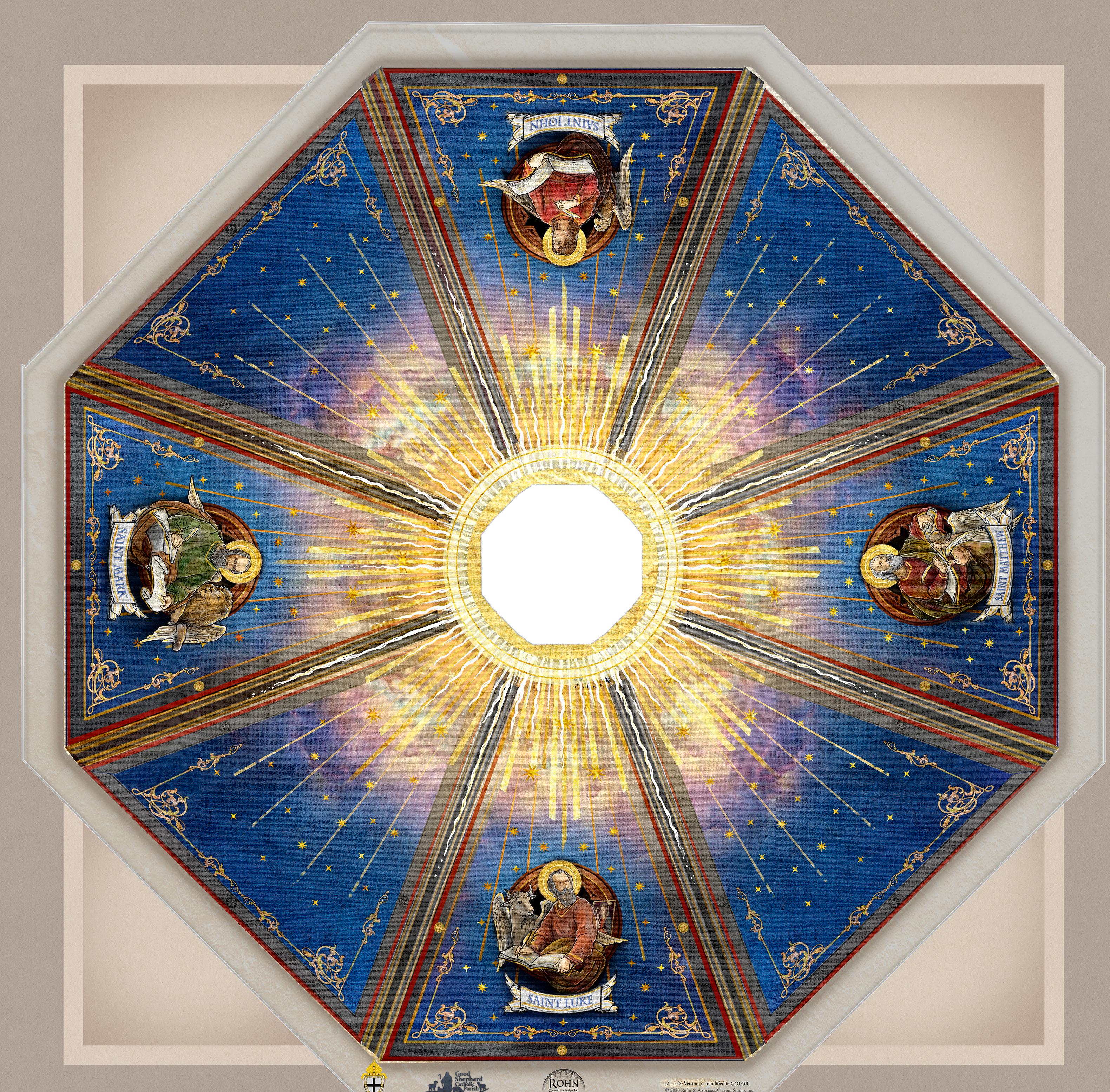 Surface: This image will be printed on artist canvas in its actual size and painted using oil paints. The process, as detailed in the contract, is to (1) provide a scaled black and white drawing for approval, (2) print the black and white image in its life size to correct distortions and provide a life-size layout for approval, (3) provide a scaled color rendering for approval, and (4) print the corrected image onto artist canvas and paint in oil paints. The completed painting will be installed onto the suspended dome panels once approved. The dome panels will have a faux wood finish that will be painted on canvas and installed onto the panel prior to installation of the evangelist painting.