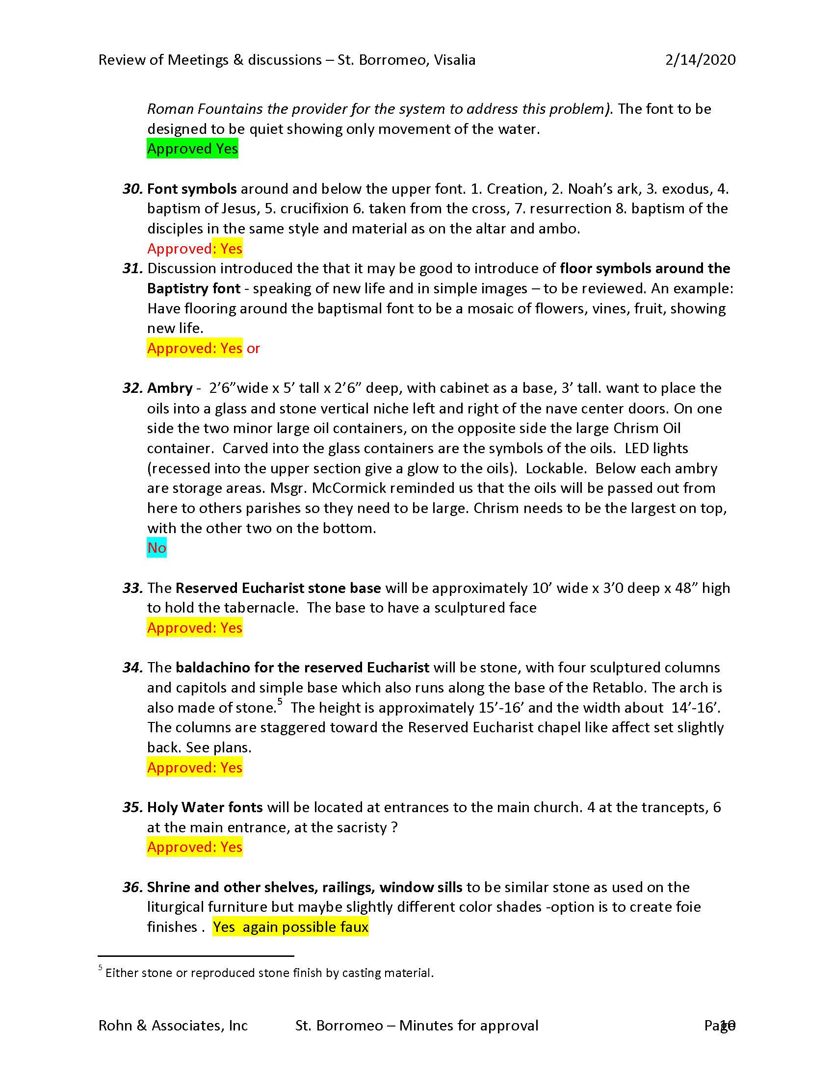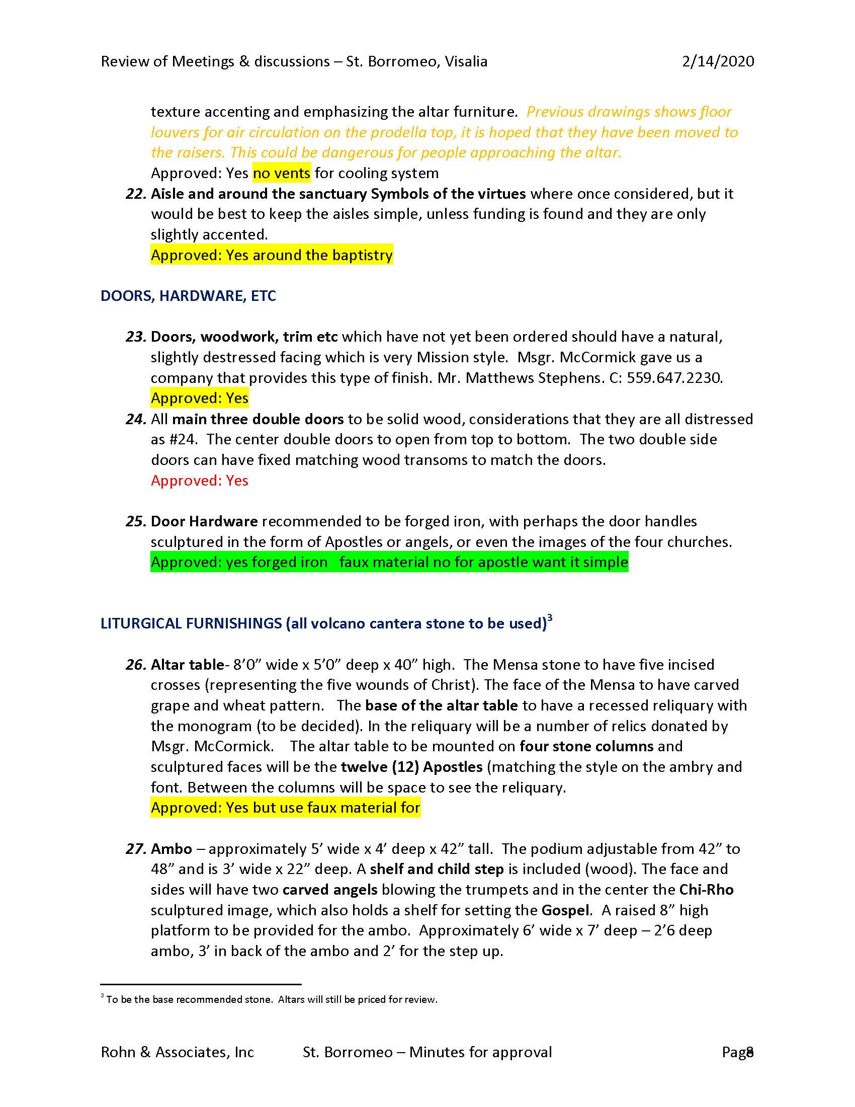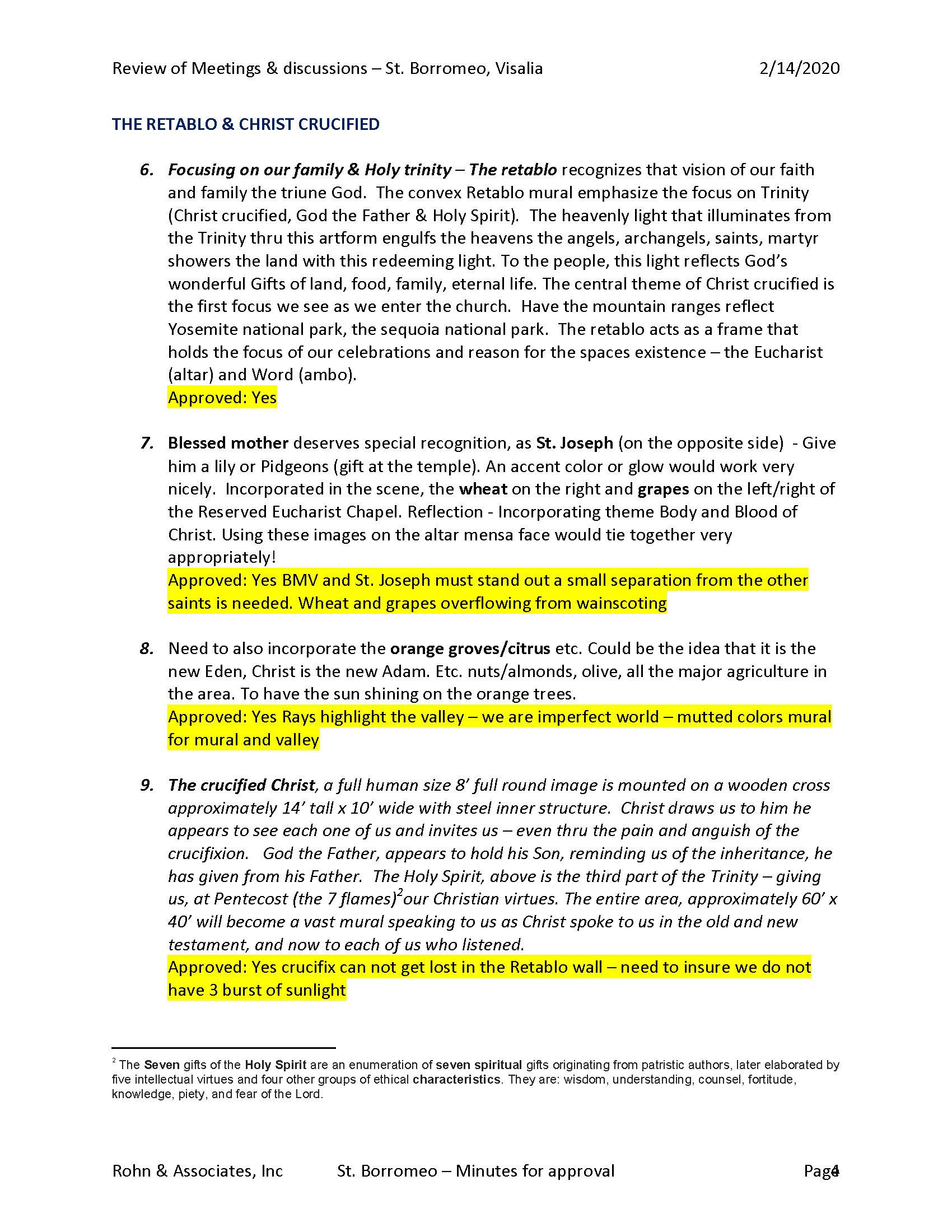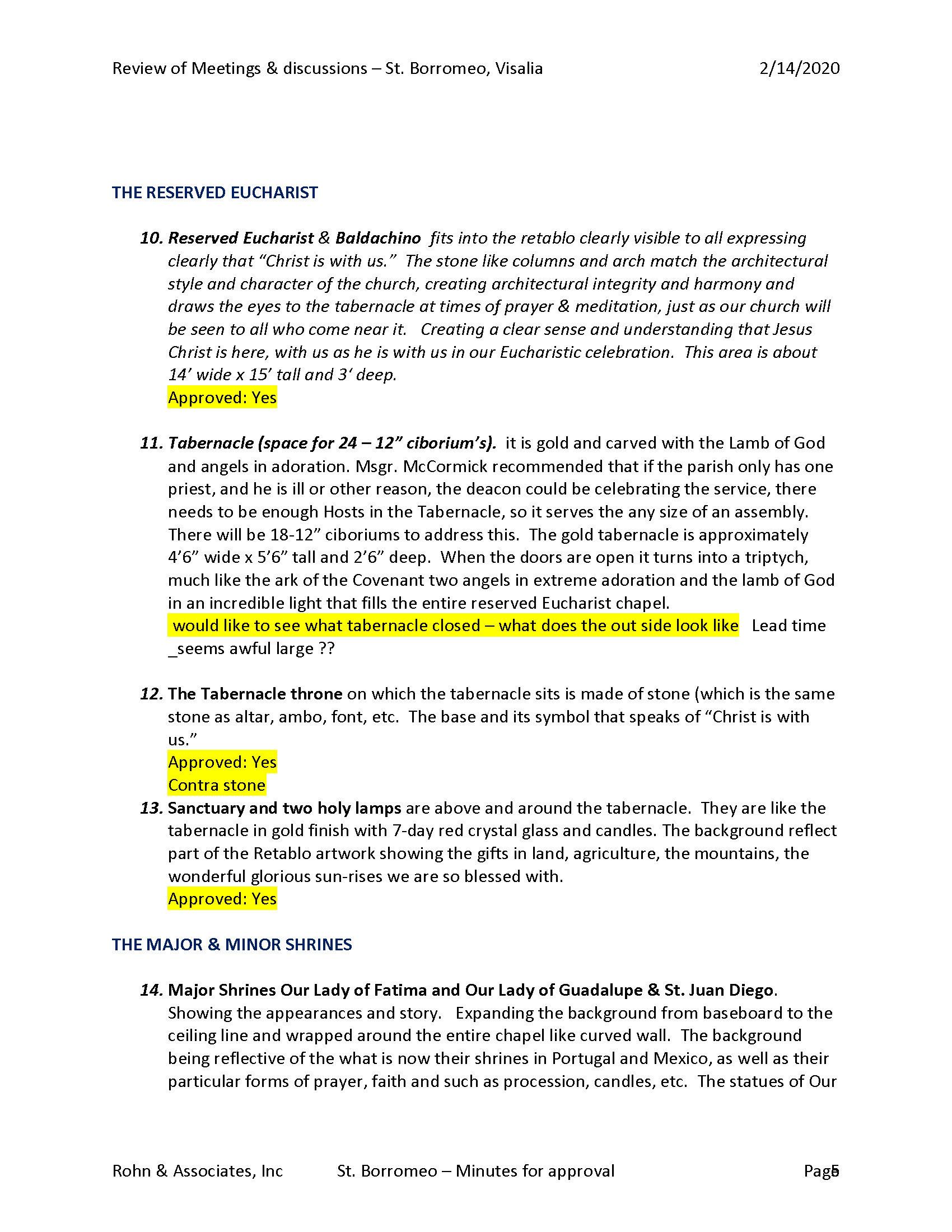 We have reviewed the designs for the artwork, the completed specifications for the liturgical furnishings, and the possible additions to the contract.