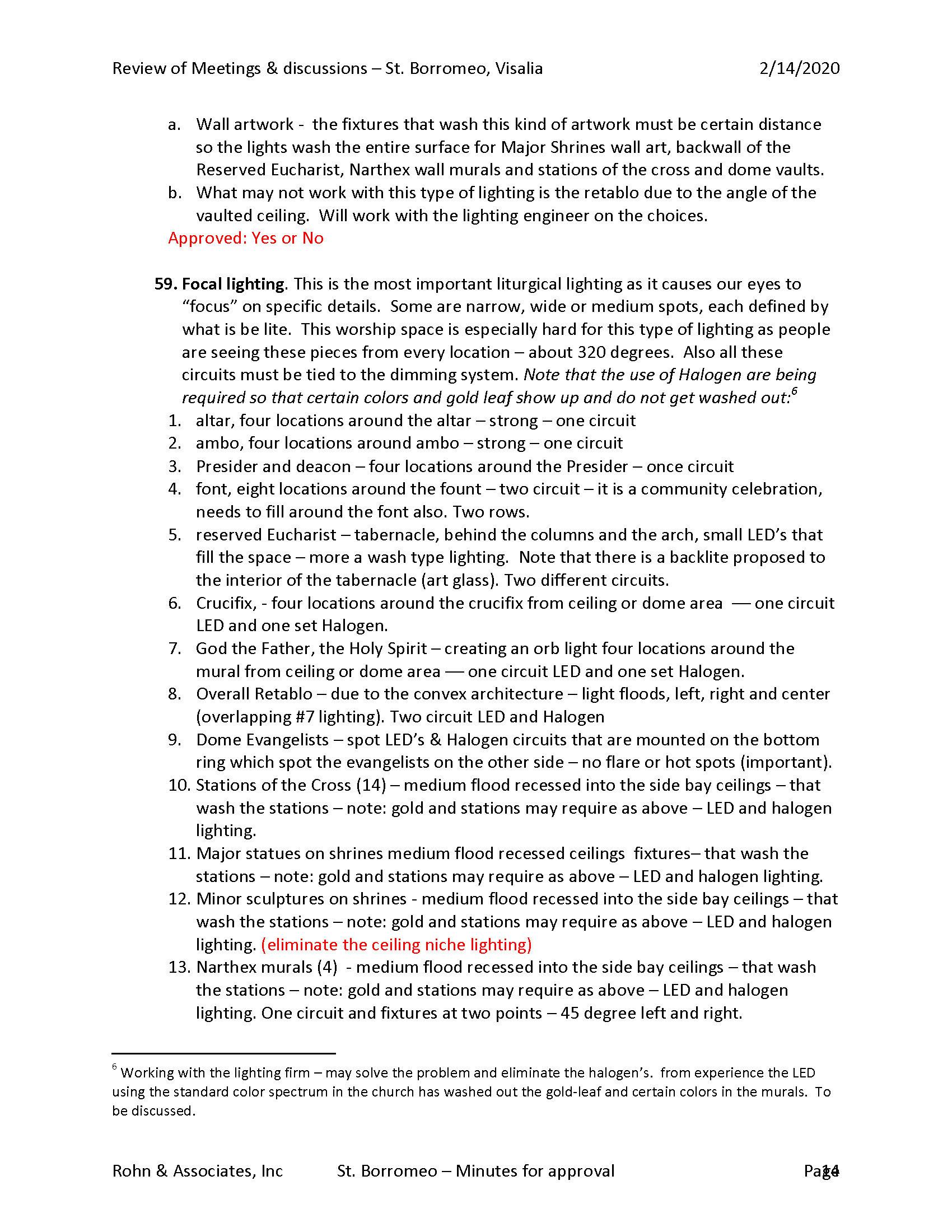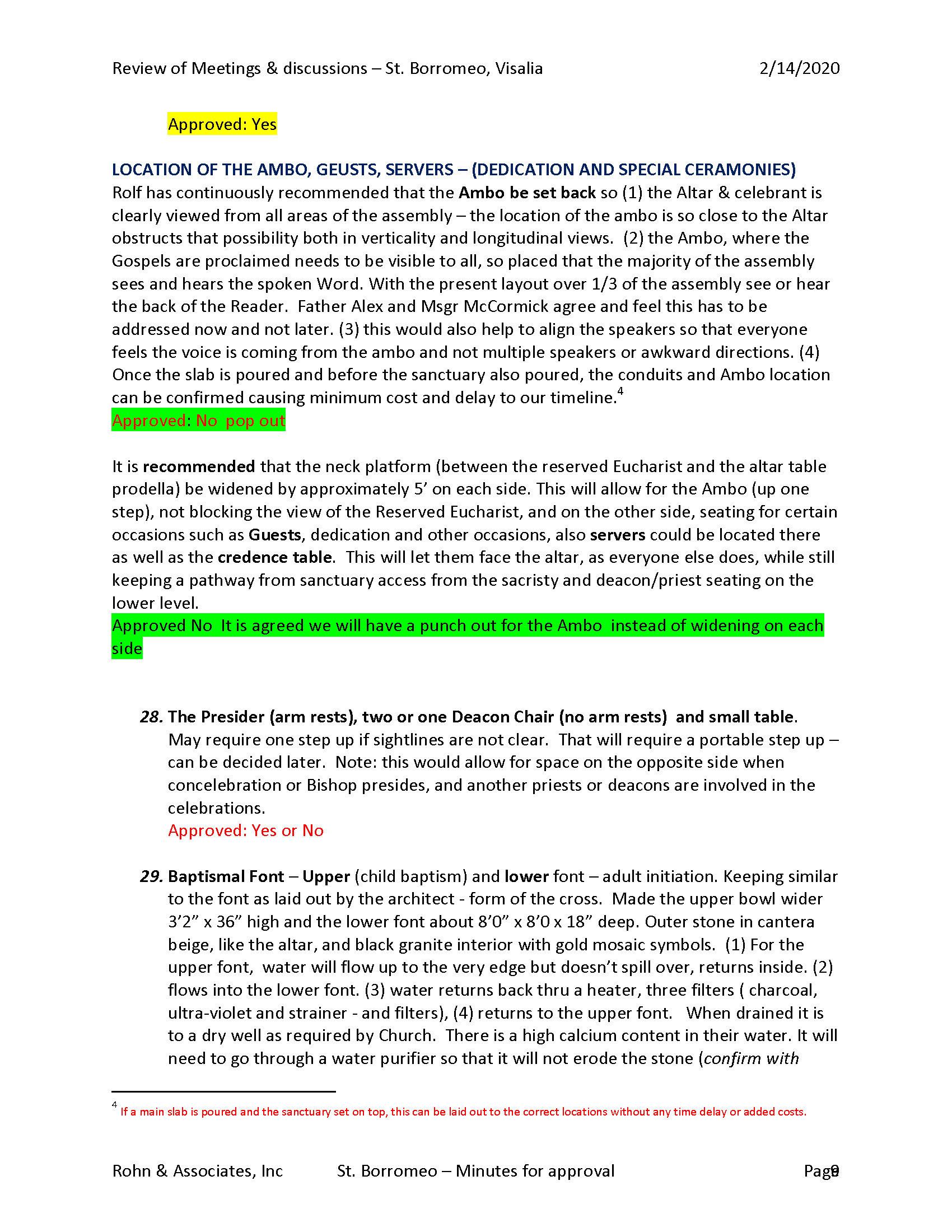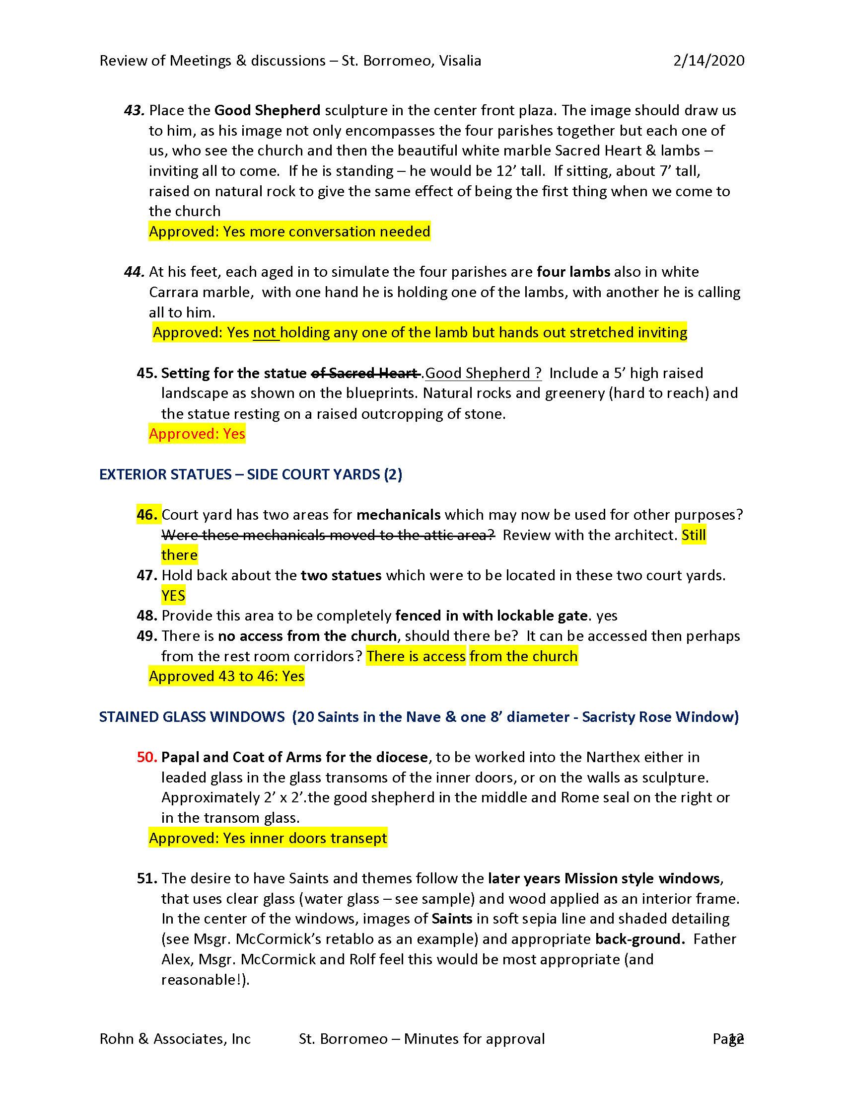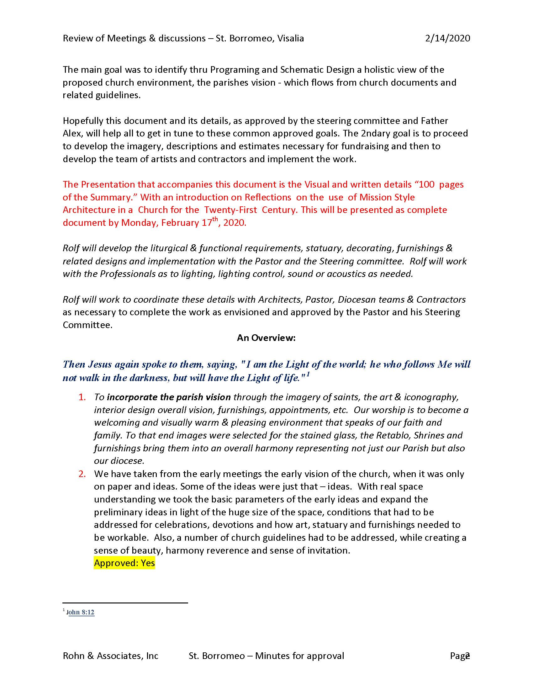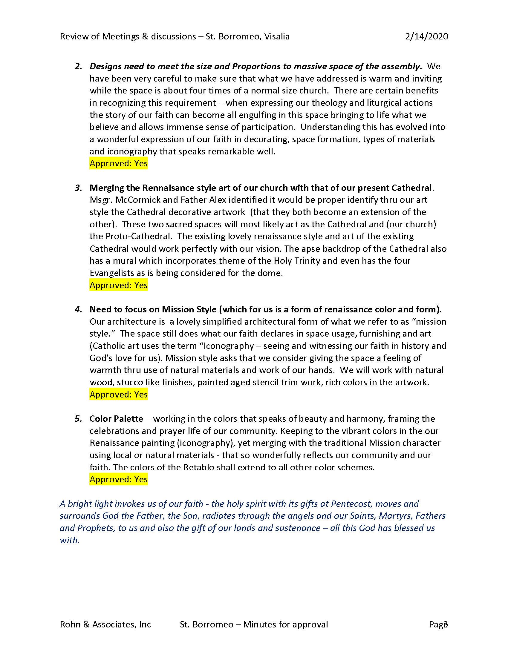 We have reviewed the designs for the artwork, the completed specifications for the liturgical furnishings, and the possible additions to the contract.