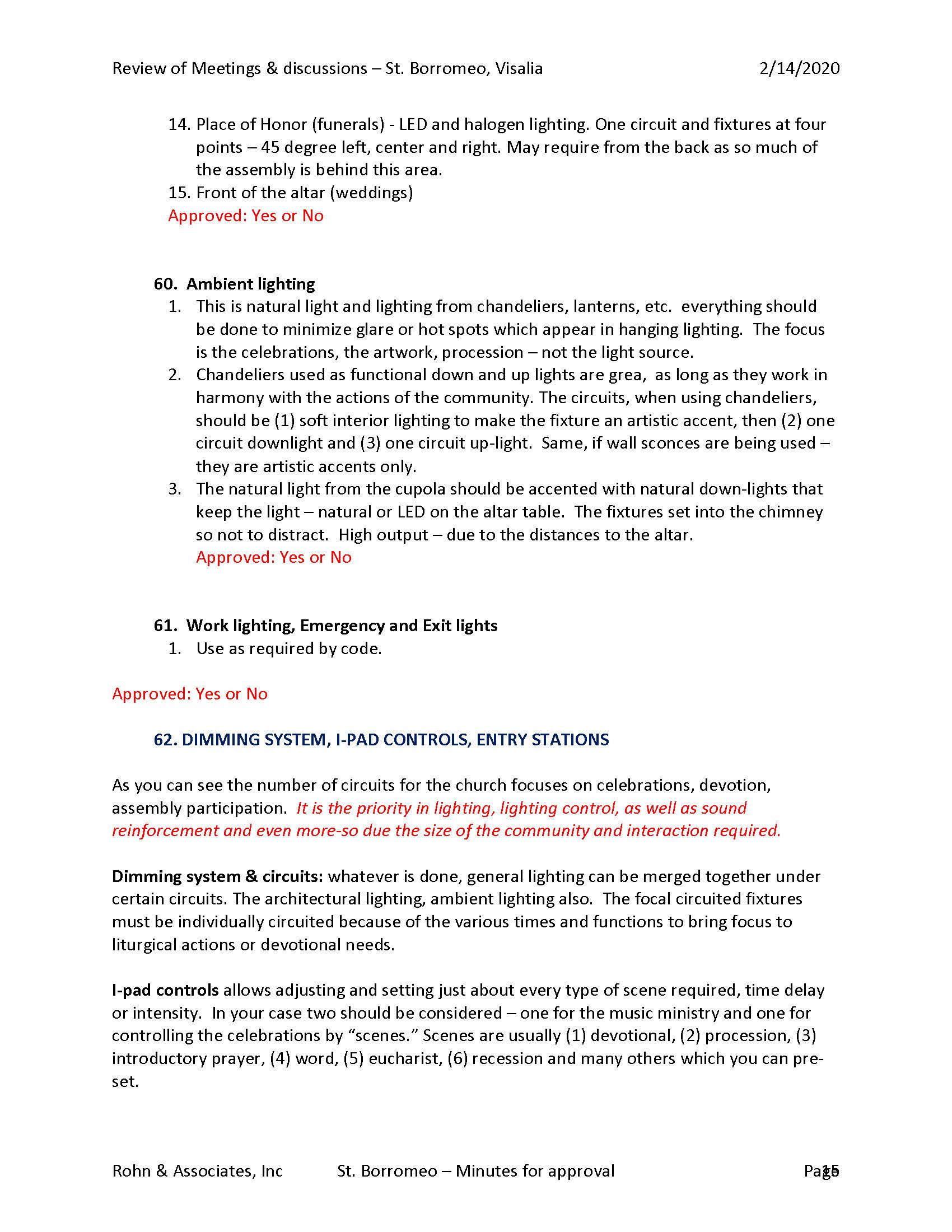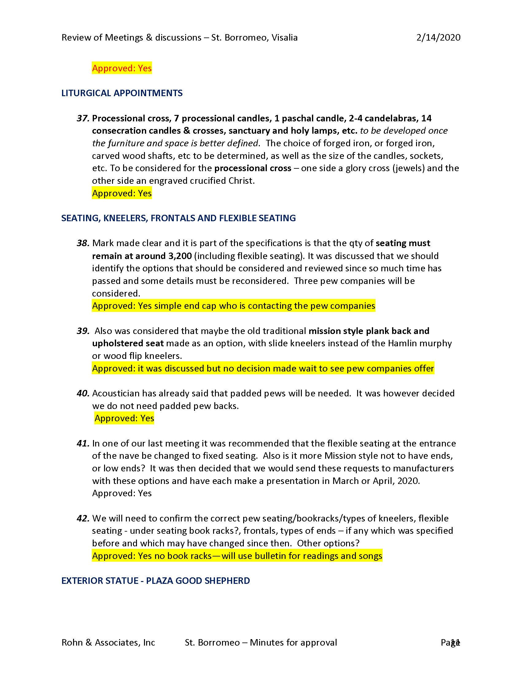 It is time to invite at least three or four pew firms to make presentations for the above, including prie-dieux, railings, etc. Due to the massive size of the church, the discussion about upholstered seats or pads will be important. Acoustical pads under the pews will not work – we can provide names and churches were this was done and failed.
