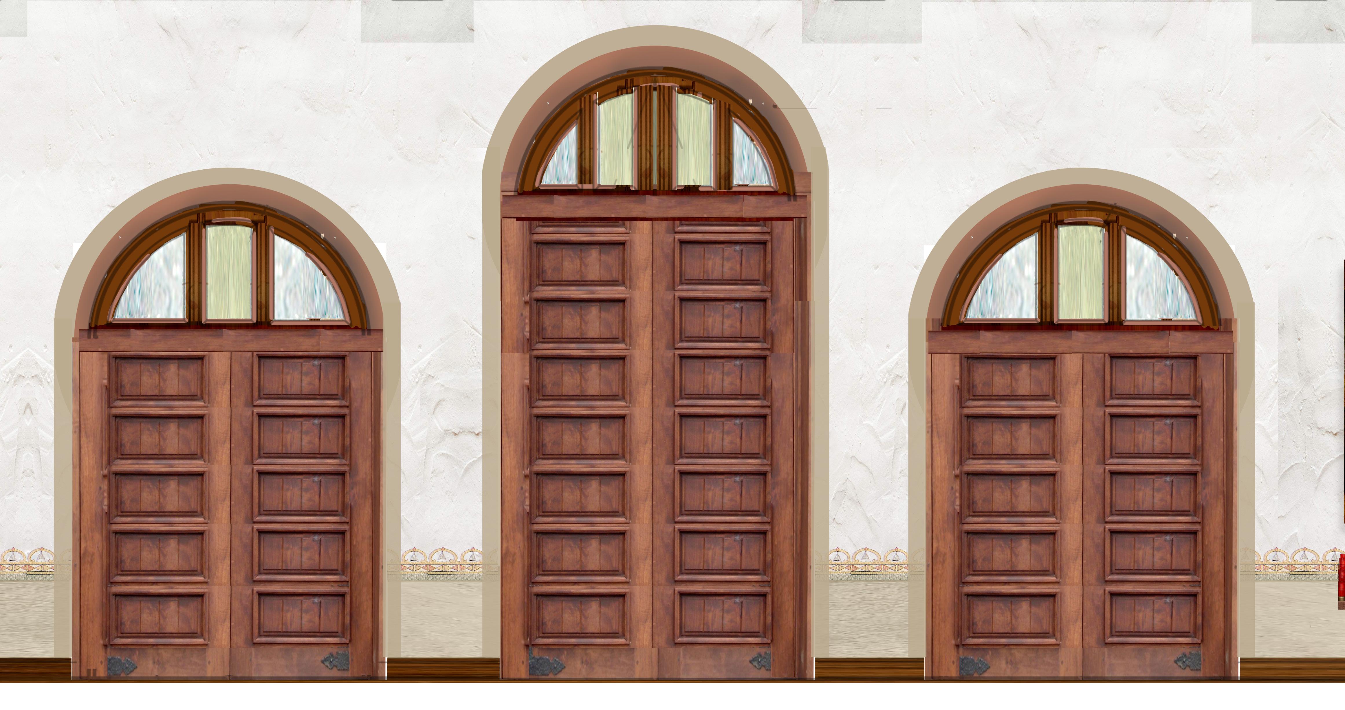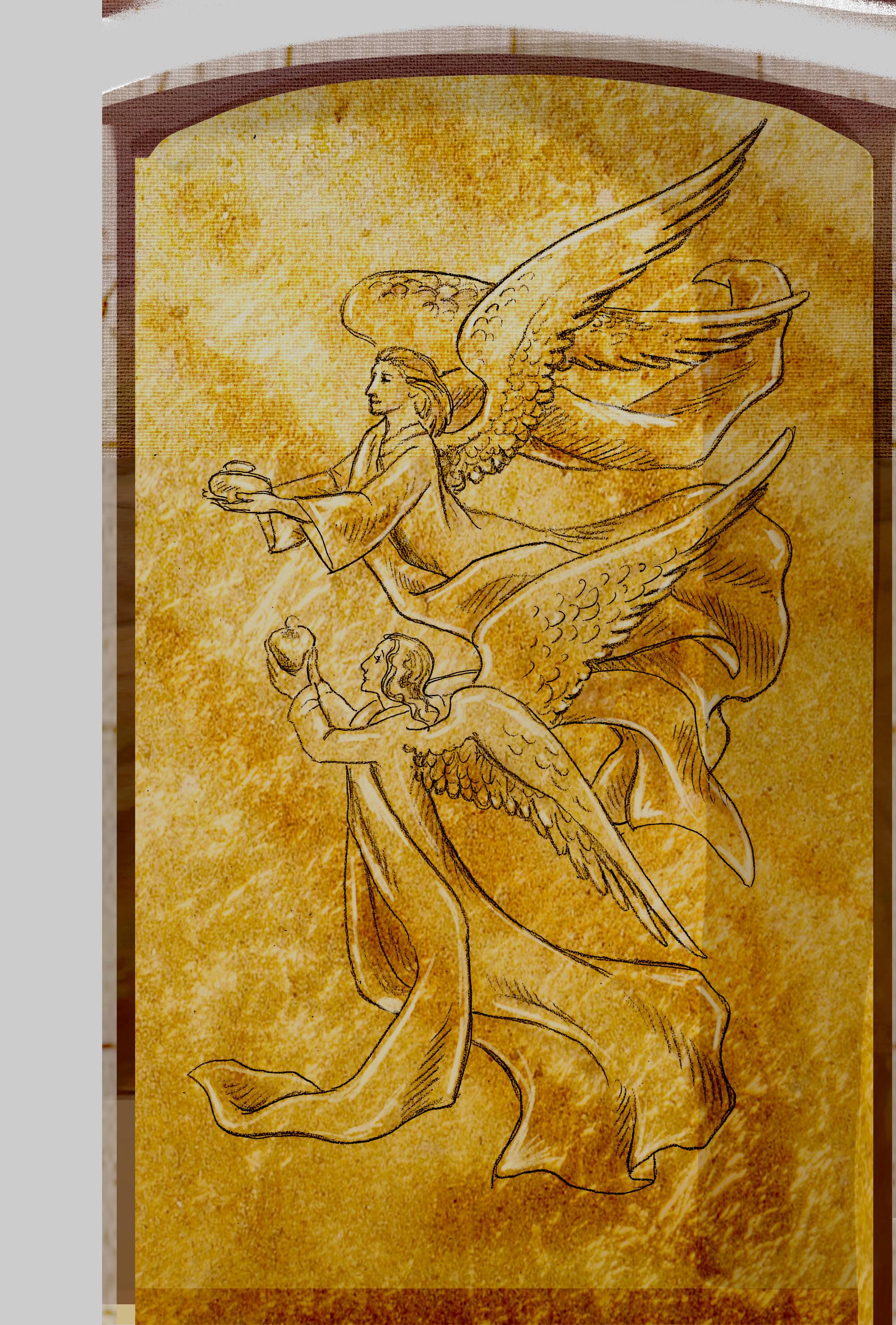 The four Evangelists would be in the tradition of the Retablo images, as shown on page 60. Each would be about 10’0” in diameter. They could emphasize the cross or be in the opposite four panels. They would be trimmed in antique gold, with background halos and garment accents.