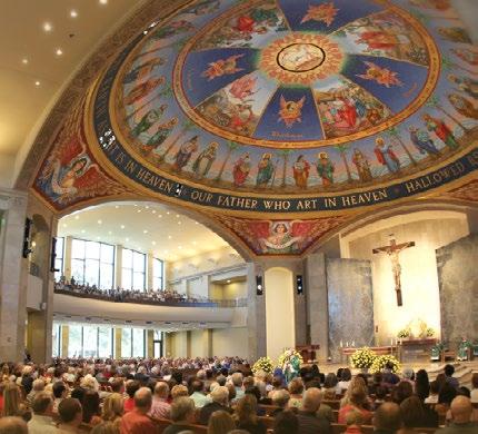• An elaborate dome with powerful imagery and the Lord’s Prayer in mosaic is the focal point of the main theme, which ties in with the new handcarved 9’ crucifix, massive marble altar table, and reserved Eucharist tabernacle.