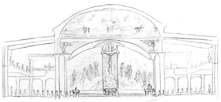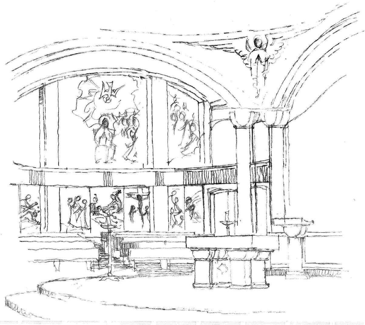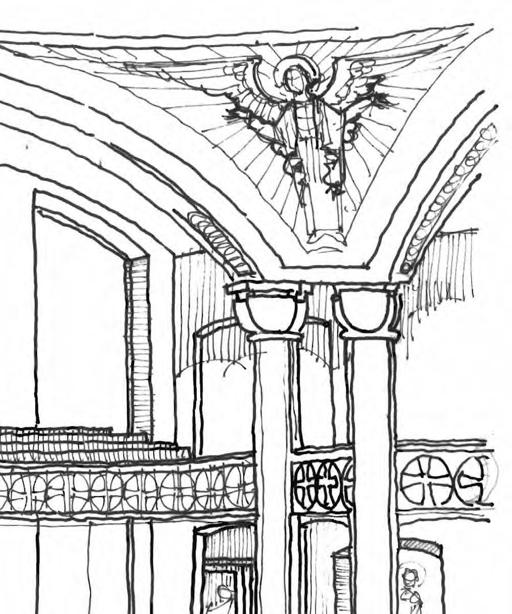 We enter and pass by the Baptistry and the living waters of creation which invite us into a new life within the Church. under the all-encompassing center dome are the Crucifix and Altar of Sacrifice where we participate in the very life of Christ through the Sacraments of Holy eucharist, Confirmation, matrimony and Holy orders. Here we are united in a profound way with Christ as members of His mystical Body. All of creation and our entire beings and lives are offered up to the father through the Cross and the Holy eucharist in praise and thanksgiving for our creation, redemption and sanctification. finally as we leave the Church and are sent forth, empowered by the Holy Spirit to make disciples of all nations, we pass by the Catafalque and are reminded of the passing of our time on earth and our ultimate birth into eternal life, a fulfillment of the new life begun at Baptism.