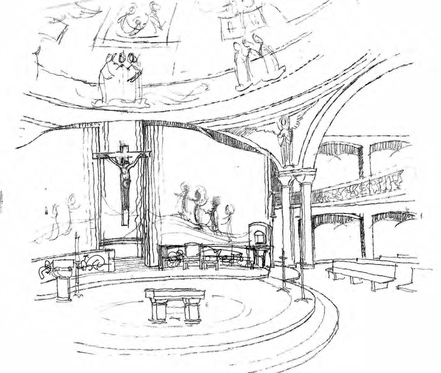 As we enter St. John Neumann Church, we are immediately drawn into this mystery. With its prominent North-South-east-West orientations, the interior takes on a cruciform dimension. Dominant within this axial floor plan is the ‘ trinity of Domes’ of the Baptistry, the Altar of Sacrifice and the Catafalque.