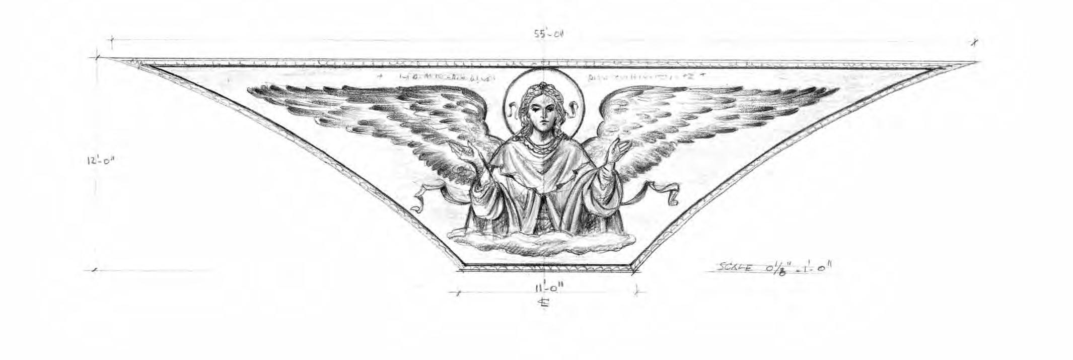 We enter and pass by the Baptistry and the living waters of creation which invite us into a new life within the Church. under the all-encompassing center dome are the Crucifix and Altar of Sacrifice where we participate in the very life of Christ through the Sacraments of Holy eucharist, Confirmation, matrimony and Holy orders. Here we are united in a profound way with Christ as members of His mystical Body. All of creation and our entire beings and lives are offered up to the father through the Blood of the Cross in praise and thanksgiving for our creation, redemption and sanctification. finally as we pass by the Catafalque and are sent forth, empowered by the Holy Spirit to make disciples of all nations, we are reminded of the passing of our time on earth and our ultimate birth into eternal life, a fulfillment of the new life begun at Baptism.
