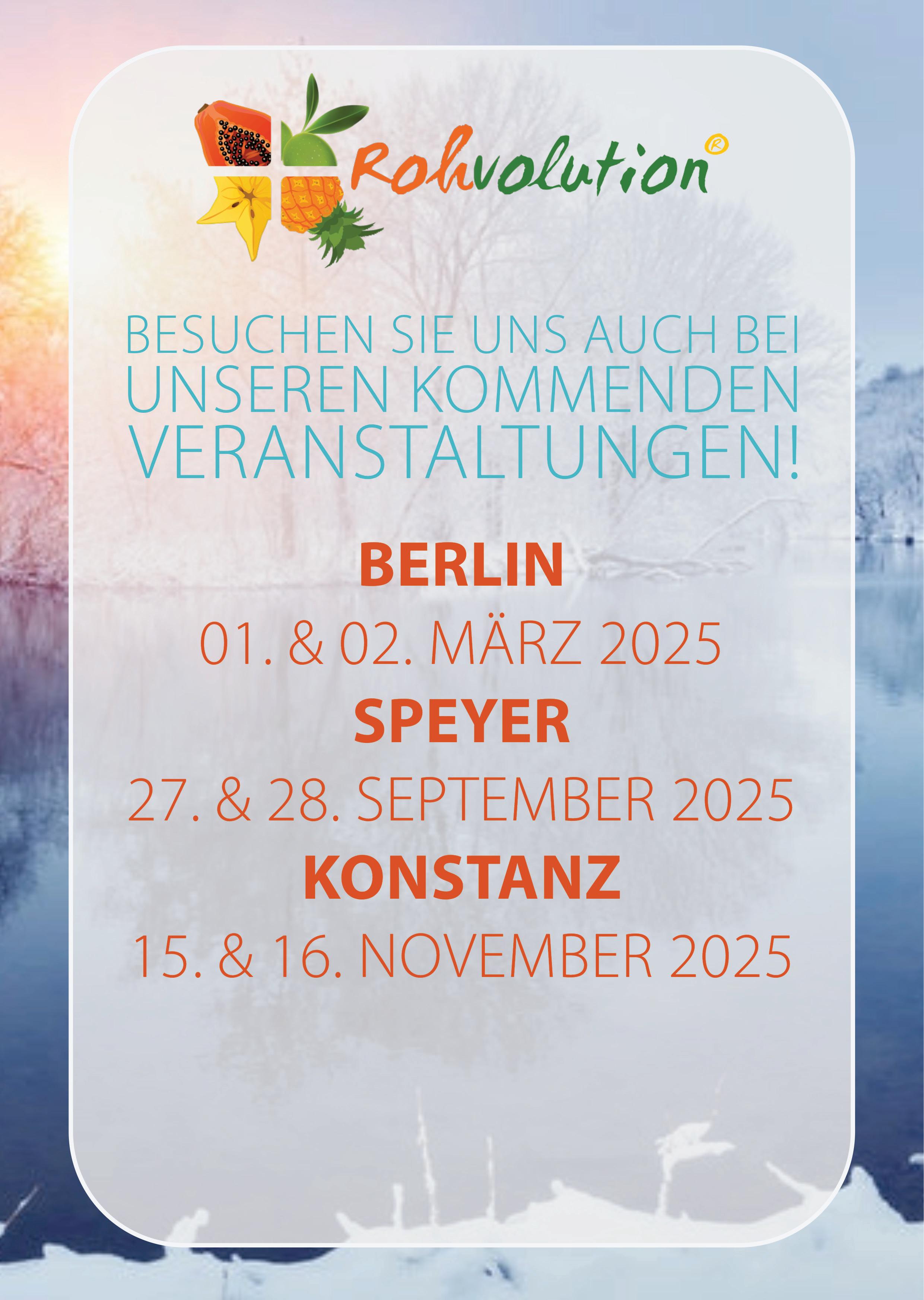 Wir freuen uns auf ein unvergessliches Wochenende voller Begegnungen, neuer Impulse und dem gemeinsamen Streben nach einem gesunden, ganzheitlichen Lebensstil. Lassen Sie sich begeistern von den Möglichkeiten, die die Rohvolution® Ihnen bietet – ganz gleich, ob Sie zum ersten Mal dabei sind oder uns schon lange begleiten.