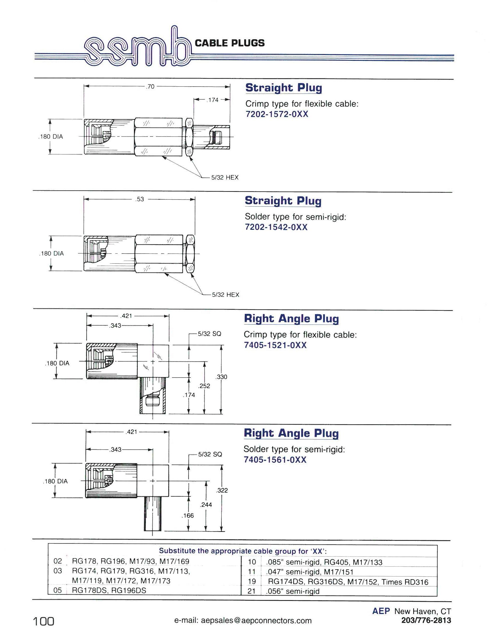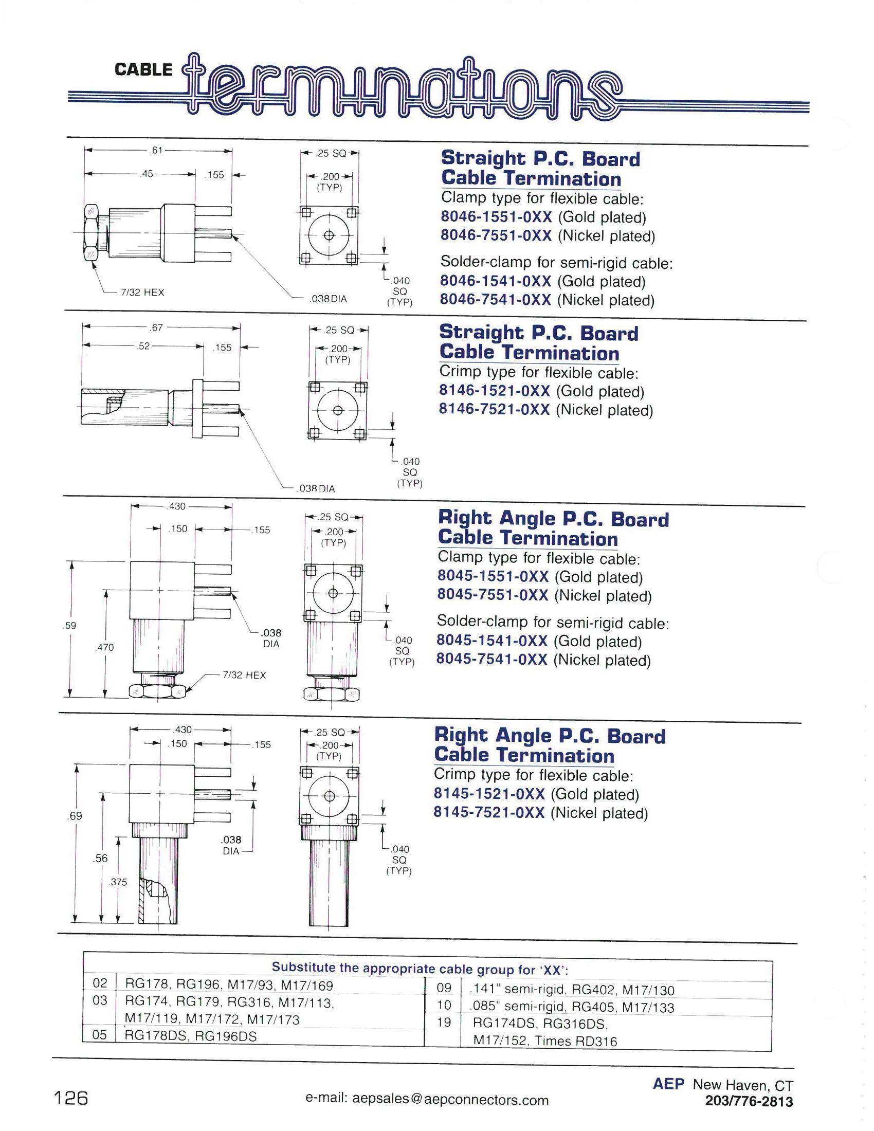 The following guide illustrates the AEP part numbering system for connectors. For additional information or AEP connector data sheets, visit us at www.radiall.com. Click on “Product Finder,” then “RF Coaxial Connectors” and select AEP.
