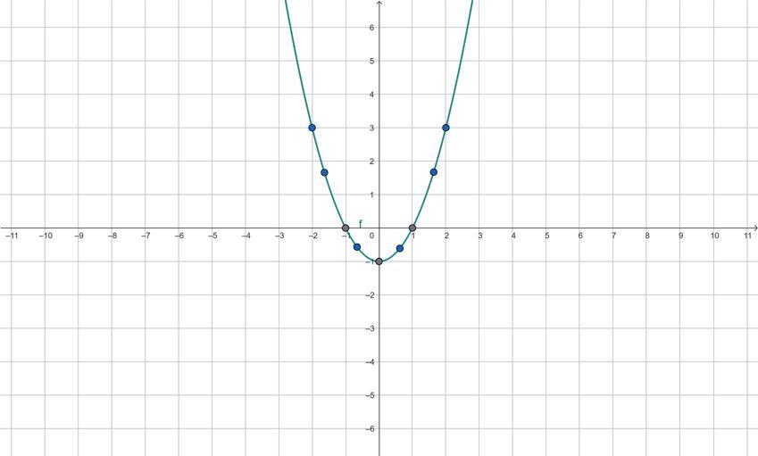 Dana je funkcija iz množice ℝ v množico ℝ s predpisom f(x) = x 2 – 1. Tabeliraj funkcijo od –2 do 2 s korakom 1 2 , izračunaj ničli in začetno vrednost, s pomočjo točk nariši graf in s pomočjo grafa določi intervale naraščanja in padanja.
