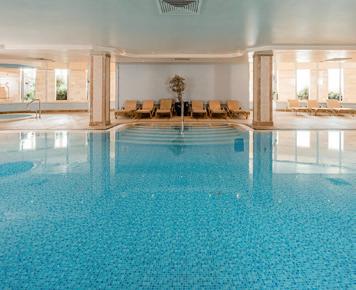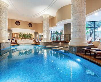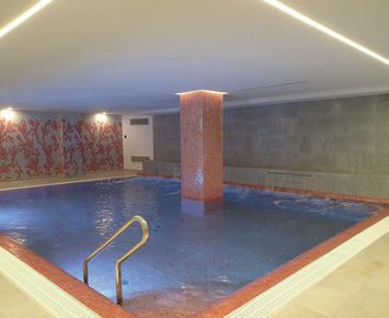 Spa-Bereich, wo diverse Wellnessanwendungen angeboten werden, mit Fitnessraum, Hallenbad, Jacuzzi, Sauna und Dampfbad.