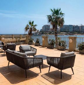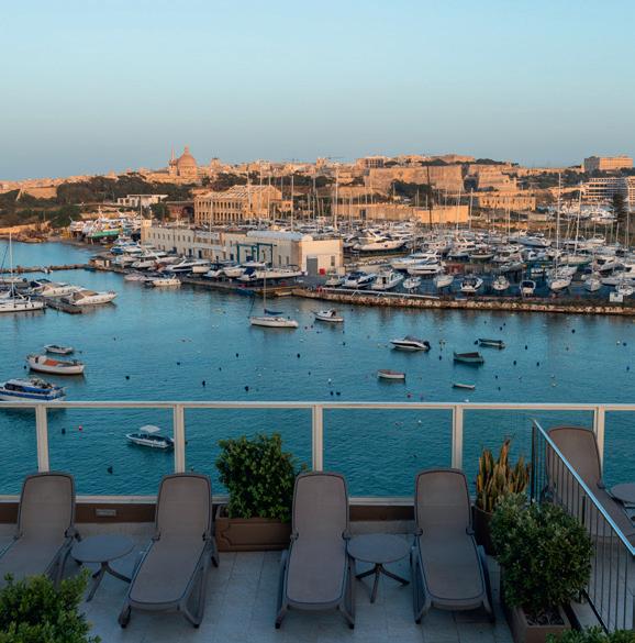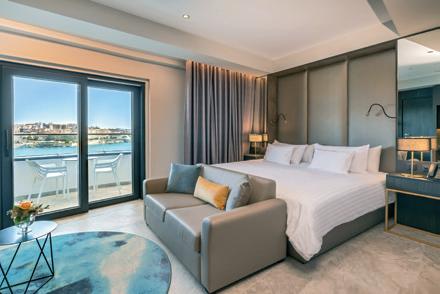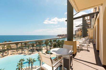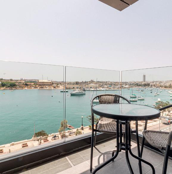 Panorama Suiten: Ein Wohntraum auf 80 m2, bieten diese Suiten einen 180° Blick auf Malta, Comino und Gozo. Zur luxuriösen Ausstattung gehören das Schlafzimmer und ein separates, grosses Wohnzimmer mit Sofabett, zwei Badezimmern und sehr grosser Balkon.