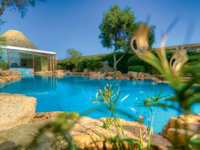 Trullo Suiten: Sind turmähnlich erbaut, sehr grosszügig mit grossem Wohn- und Schlafbereich gestaltet und liegen besonders ruhig in den Ecken der Hotelanlage. Diese Suite verfügt über Liegestühle und Sonnenschirme auf der grossen Terrasse.