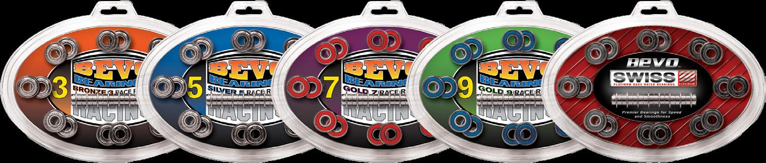 Bevo™ bearings are engineered and manufactured to surpass the quality of standard bearings. Only chrome steel races and retainers are used in the manufacturing of Bevo™ Bearings. The quality and characteristics of chrome steel not only dramatically increases the life of your bearings, it also assures maximum performance resulting in a faster smooth er ride. Our custom DEEP groove channel stabilizes the roll, reducing vibration and roll resistance. Only self channeling synthetic lubricants are used in Bevo™ bearings. You can rest assured when riding on genuine Bevo™ Gold or Silver rated bearings, you will max imize your performance.
