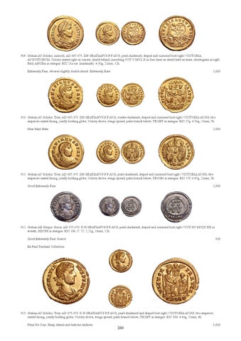 911. Gratian AV Solidus. Trier, AD 367-375. DN GRATIANVS P F AVG, pearl-diademed, draped and cuirassed bust right / VICTORIA AVGG, two emperors seated facing, jointly holding globe; Victory above, wings spread; palm branch below; TR•OB• in exergue. RIC 17f. 4.47g, 22mm, 5h. Good Extremely Fine.