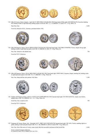 527. Vespasian AV Aureus. Rome, July - December AD 71. IMP CAES VESP AVG P M, laureate head right / VIC AVG, Victory standing right on a globe, holding wreath and palm branch. RIC 47; C. 583; BMCRE 63; BN 47; Calicรณ 698. 7.31g, 20mm, 6h. Very Fine. Part of the series of victory issues struck after the successful conclusion of the Jewish War. From a central European collection; Ex Aureo & Calicรณ 258, 20 March 2014, lot 1154.