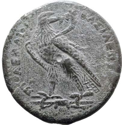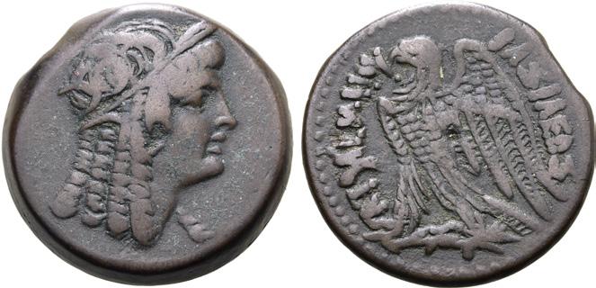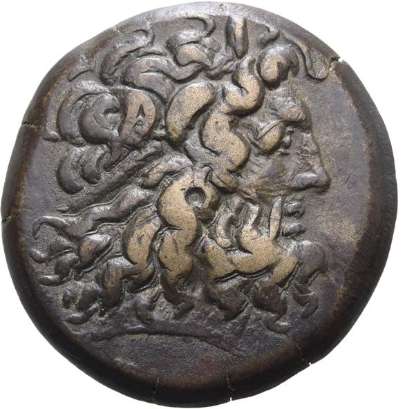 9) Ptolemaic Kingdom of Egypt, Kleopatra III and Ptolemy IX Soter II (Lathyros) Æ 27mm. Alexandria, dated RY 3 = 115/4 BC. Bearded head of Herakles to right, wearing lion skin; K behind / ΠΤΟΛΕΜΑΙΟΥ [ΒΑΣΙΛΕΩΣ], eagle with closed wings standing to left on thunderbolt; Ω over Σ to left, L Γ (date) to right. Faucher & Lorber Series 8; Svoronos 1190 (Ptolemy IV; Uncertain mint in Cyprus); SNG Copenhagen 533 (Ptolemy V; Uncertain mint in Phoenicia); DCA 35 (Ptolemy V). 17.14g, 27mm, 11h.