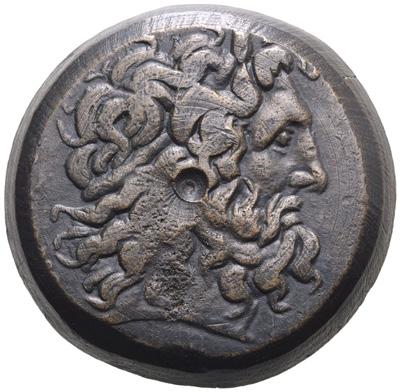 3) Ptolemaic Kingdom of Egypt, Ptolemy II Philadelphos Æ Diobol. Alexandria, from 275/4 BC. Laureate head of Zeus to right / ΠΤΟΛΕΜΑΙΟΥ ΒΑΣΙΛΕΩΣ, eagle with wings spread standing to left on thunderbolt; to left, monogram above Galatian shield; c/m: incuse trident. CPE B166; Svoronos 600. 17.28g, 27mm, 12h.