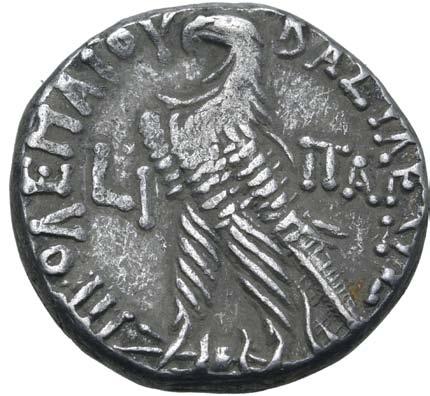 head to right, wearing aegis / ΠΤΟΛΕΜΑΙΟΥ BAΣΙΛΕΩΣ, eagle standing to left on thunderbolt, palm frond over shoulder; L B (date) over headdress of Isis to left, ΠΑ to right. Svoronos 1817 (Ptolemy XIII); SNG Copenhagen 398; DCA 70. 11.07g, 24mm, 11h.