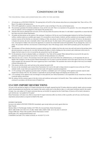 All estimates are in POUNDS STERLING. The opening bids will be 80% of the estimate unless there are existing higher bids. There will be a 19% Buyer’s Fee added to the hammer price. II. VAT at 20% (applicable to customers within the UK and EU) is due on the Buyer’s Fee only, not the hammer price. III. The auctioneer guarantees the absolute authenticity of any and all coins sold. There is no expiration to this guarantee. Any coins subsequently found to be not authentic will be exchanged for a full refund of the purchase price. IV. Absentee bids must be submitted and received by 20:00 on the day before the auction at the latest. It is the bidder’s responsibility to ensure that bids have been received by Roma Numismatics. V. All grades and descriptions are the opinion of the cataloguer. Conditions of all lots are as per the photographs displayed on the Roma Numismatics website; condition reports are available upon request. It is not possible to note all marks or defects, and thus customers are encouraged to carefully examine in person all lots that they are interested in bidding on. Bids, once placed, are final and will not be rescinded. If, however, the description is found to be incorrect, the item is returnable within 21 days after the sale. No other returns will be accepted except on the grounds of non-authenticity. All prospective bidders who exercise the opportunity to examine lots in hand shall assume all responsibility for any damage they cause in so doing. The auctioneer shall have sole discretion in determining the value of the damage caused, which shall be promptly paid by the prospective bidder. VI. The auctioneer will have absolute discretion to accept or decline any bid, withdraw lots from sale at any time until such point as the purchaser takes physical possession, re-open any lot, even after the hammer has fallen, in which a bidding error has occurred, and to determine in the event of a dispute, the final winner of a lot or to rescind the sale and put the lot up for sale again. VII. For the protection of mail or absentee bidders, no ‘unlimited’ or ‘buy’ bids will be accepted. When identical bids are received for the same lot, preference will be given to the bid received first. A mail bid will take preference over a floor bid. VIII. Some lots may carry a reserve. The auctioneer reserves the right not to sell an item below the confidential price, or will repurchase the item on behalf of the consignor or for the account of Roma Numismatics Ltd. If a reserve exists the auctioneer reserves the right to bid on any lot on behalf of the consignor up to the amount of the reserve against any floor or mail bidders. The auctioneer also reserves the right to bid on any lot on behalf of Roma Numismatics Ltd. IX. Title remains with the owner until such time as the customer has paid in full. X. Invoices are due immediately upon receipt. Roma Numismatics Ltd. reserves the right to charge interest on unpaid invoices at the rate of 2% per calendar month, except where prior agreement has been made with regards to payment arrangements. XI. A 3.5% surcharge will be applied to payments made via PayPal or credit/debit card. A £10 surcharge will be applied to payments made by bank transfer from outside of the UK. The customer is responsible for paying all bank charges and shipping and insurance costs. XII. A 3% surcharge will be applied to lots won through www.the-saleroom.com. Roma Numismatics is not responsible for any missed lots or bids due to network speed or down-time. XIII. By making a bid the customer agrees to the above terms and conditions and accepts to be bound by them. These conditions shall take effect and be construed in accordance with the provisions of English Law.