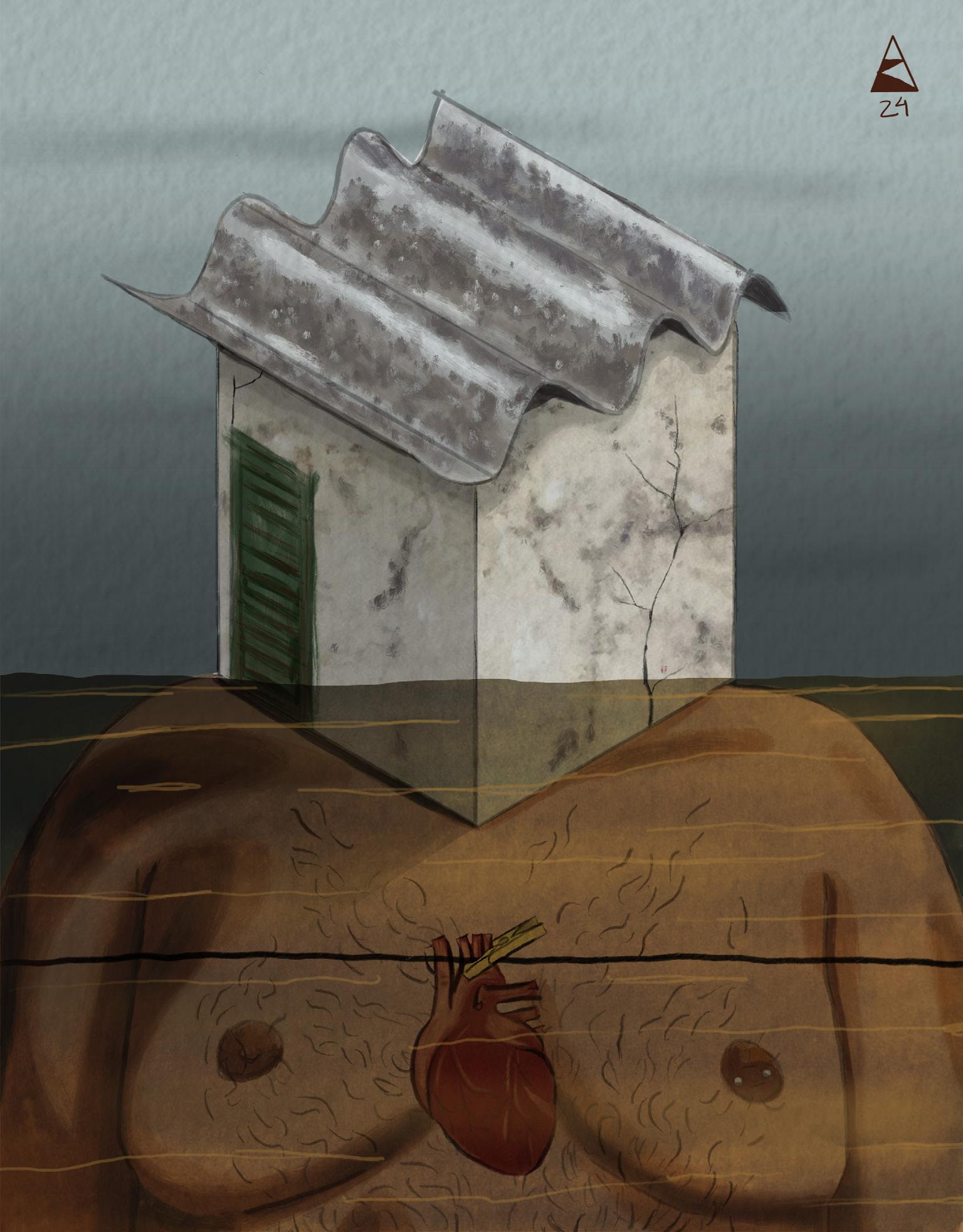 Essa ilustração reflete sobre os processos de isolamento experienciados durante os anos da pandemia de Covid-19. Pelas representações dos aspectos materiais de um quarto, o artista ilustra os processos de degradação mental vividos por inúmeras pessoas, pela sociedade inteira e por ele mesmo. Sobre o aspecto mais íntimo do autor, a pessoa isolada na cama retrata as transformações bruscas sofridas por seu corpo, o agravamento da ansiedade social, a busca de fuga através do sono e, na forma de porta-retratos, o peso dos pensamentos ininterruptos, do autojulgamento e do julgamento dos outros.