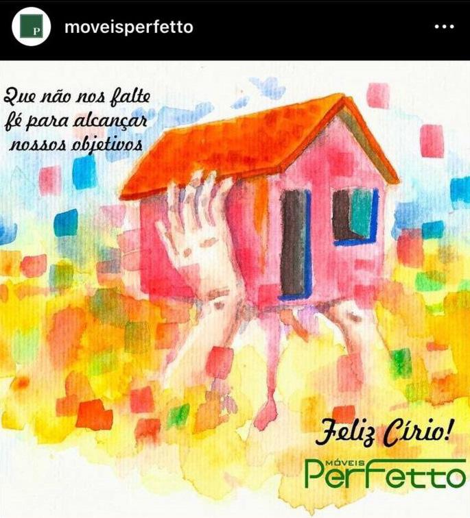 Ilustração de homenagem ao Círio de Nazaré, para as redes sociais da loja de móveis planejados Perfetto. A ilustração resgata o campo da arquitetura, representada pelas casas levadas por pagadores de promessas na procissão, como um importante elemento da iconografia dessa festa religiosa.