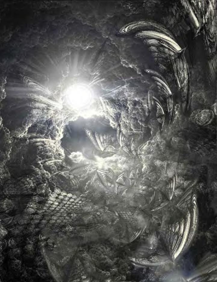Page 69 : Au commencement, 2020, mezzotinte, 40 Ă 50 cm. MĂ©taphore des Ă©lĂ©ments architectes, basĂ©e sur áŒÏÏÎŹÎłÎłÎ”Î»ÎżÏ / arkhĂĄngelos, qui veut dire « commencement », Descensus in limbus, 2021, mezzotinte, 40 Ă 50 cm. Descente du Christ dans les limbes des patriarches, dans lâHadĂšs